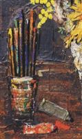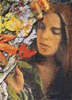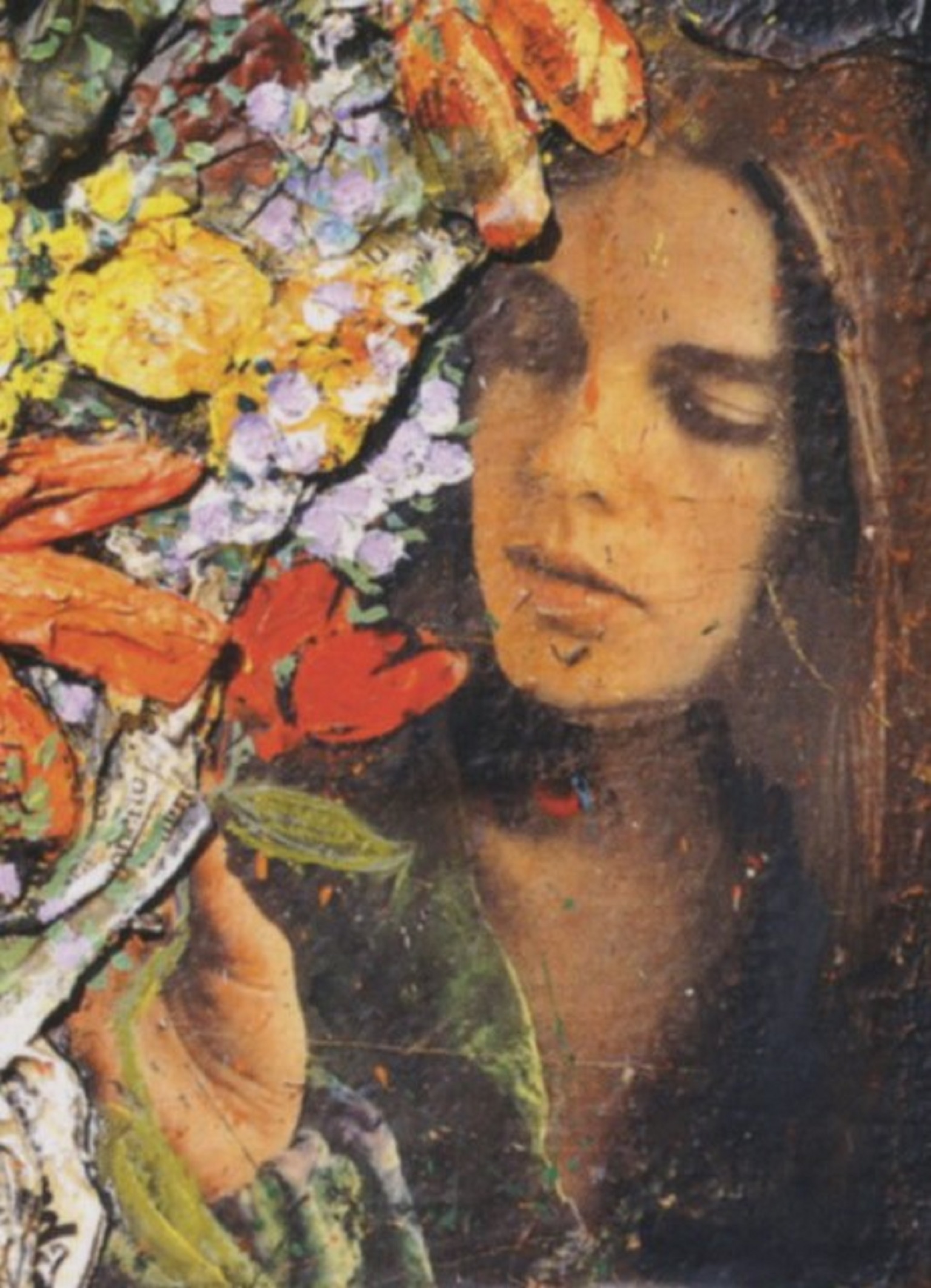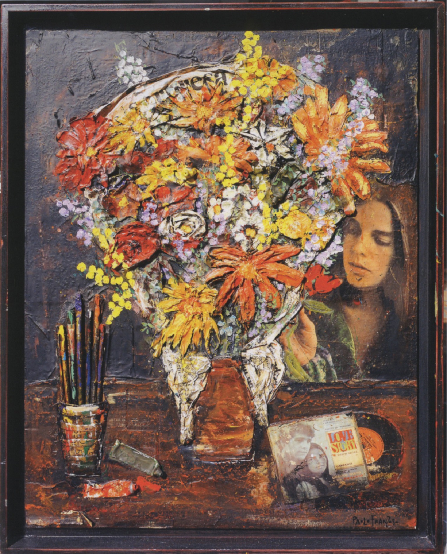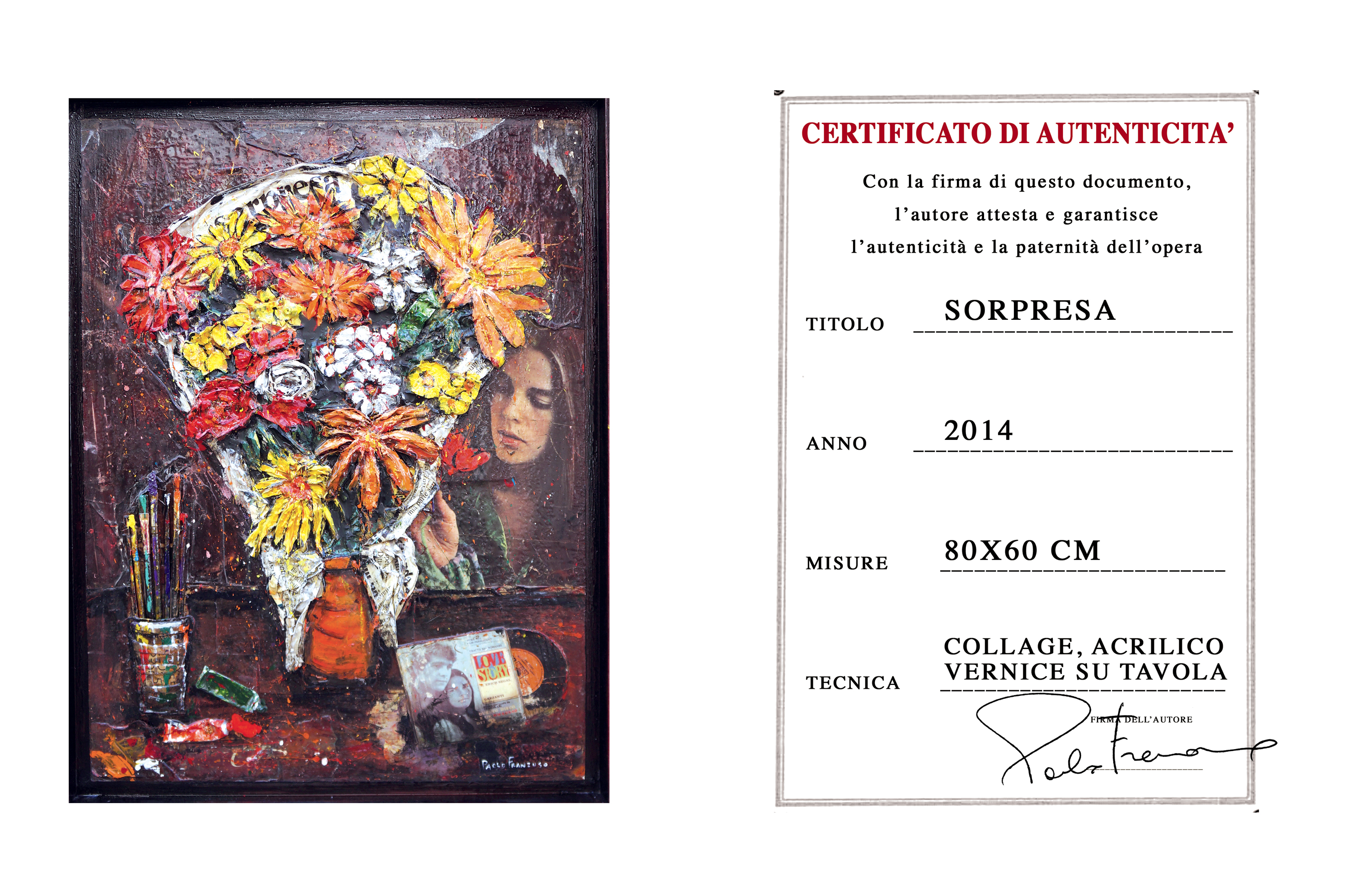 FIRMATO IN BASSO A DESTRA RICEVERE UN BEL MAZZO DI FIORI È SEMPRE UNA SORPRESA GRADITA PER LA MAGGIOR PARTE DELLE DONNE. IL MERAVIGLIOSO E COLORATO MAZZO DISEGNATO DA FRANZOSO, RICCO DI BIANCHE MARGHERITE, MIMOSE GIALLE E TANTI ALTRI FIORI ARANCIONI, ROSA E AZZURRI PALLIDI, È SICURAMENTE UN DONO DI AMORE, COME TESTIMONIA ANCHE IL DISCO “LOVE STORY” SUL TAVOLO. LA RAGAZZA RAFFIGURATA ALLA DESTRA DEL VASO DI FIORI SEMBRA GRADIRE MOLTO QUESTO REGALO. DAL BARATTOLO DI PENNELLI E I TUBETTI DI COLORE SPARSI SUL TAVOLO SI INTUISCE LA PRESENZA SILENZIOSA DELL’ARTISTA, COME A DIMOSTRARE CHE SIA LUI DIETRO QUELLA BELLA SORPRESA. LE SUGGESTIVE ATMOSFERE VISIVE CONTENUTE NELLE OPERE DI PAOLO FRANZOSO HANNO IL POTERE DI RAPIRE LO SGUARDO DELLA PERSONA CHE CI SI TROVA DI FRONTE, DI INCURIOSIRE IL SUO ANIMO E INDURLA A FARE UN VIAGGIO ALL’INTERNO DI QUELLO SQUARCIO DI MONDO DOVE IMMAGINI, COLORI, PAROLE DI VITA, OGGETTI E MATERIALI RICICLATI TENTANO DI SOVRAPPORSI PER USCIRE DALLA TELA STESSA. LE SUE OPERE SI CARATTERIZZANO PER LE LORO “CAOTICHE ATMOSFERE”, IN CUI PERDERSI PER POI RITROVARSI IN QUALCHE ANGOLO DEL QUADRO, NEL RESPIRO SILENZIOSO DEL PROPRIO EQUILIBRIO. IL DONO PIÙ GRANDE CHE POSSIEDE PAOLO FRANZOSO È QUELLO DI SAPER DARE NUOVA VITA ALLE COSE, REINTERPRETANDOLE, CON ENORME SLANCIO CREATIVO. ******************** SIGNED BOTTOM RIGHT RECEIVING A BEAUTIFUL BOUQUET OF FLOWERS IS ALWAYS A WELCOME SURPRISE FOR MOST WOMEN. THE WONDERFUL AND COLORFUL BOUQUET DESIGNED BY FRANZOSO, ABUNDANT OF WHITE DAISIES, RED ROSES, YELLOW MIMOSAS AND MANY OTHER ORANGE, PINK AND PALE BLUE FLOWERS, IS CERTAINLY A GIFT OF LOVE, AS THE "LOVE STORY" DISC ON THE TABLE ALSO TESTIFIES. THE GIRL PORTRAYED TO THE RIGHT OF THE FLOWER VASE SEEMS TO LIKE THIS GIFT VERY MUCH. FROM THE CAN OF BRUSHES AND THE COLORED TUBES SCATTERED ON THE TABLE, ONE CAN SENSE THE SILENT PRESENCE OF THE ARTIST, AS IF TO SHOW THAT HE IS BEHIND THAT BEAUTIFUL SURPRISE. THE EVOCATIVE VISUAL ATMOSPHERE CONTAINED IN THE COLLAGES OF PAOLO FRANZOSO, HAVE THE POWER TO ENCHANT THE VIEWER, TO INTRIGUE HIS/HER MIND AND LEAD HIM/HER TO MAKE A WANDER INSIDE THAT PIECE OF WORLD WHERE IMAGES, COLORS, WORDS OF LIFE, OBJECTS AND RECYCLED MATERIALS TRY TO OVERLAP TO COME OUT FROM THE CANVAS ITSELF. HIS ARTWORKS ARE CHARACTERIZED BY THEIR "CHAOTIC ATMOSPHERE", IN WHICH GETTING LOST TO FIND OURSELVES IN SOME CORNER OF THE PICTURE, IN THE SILENT BREATH OF OUR OWN BALANCE. THE GREATEST GIFT THAT PAUL FRANZOSO HAS, IT IS THE ABILITY TO GIVE NEW LIFE TO THINGS, REINTERPRETING THEM, WITH ENORMOUS CREATIVE ENERGY.