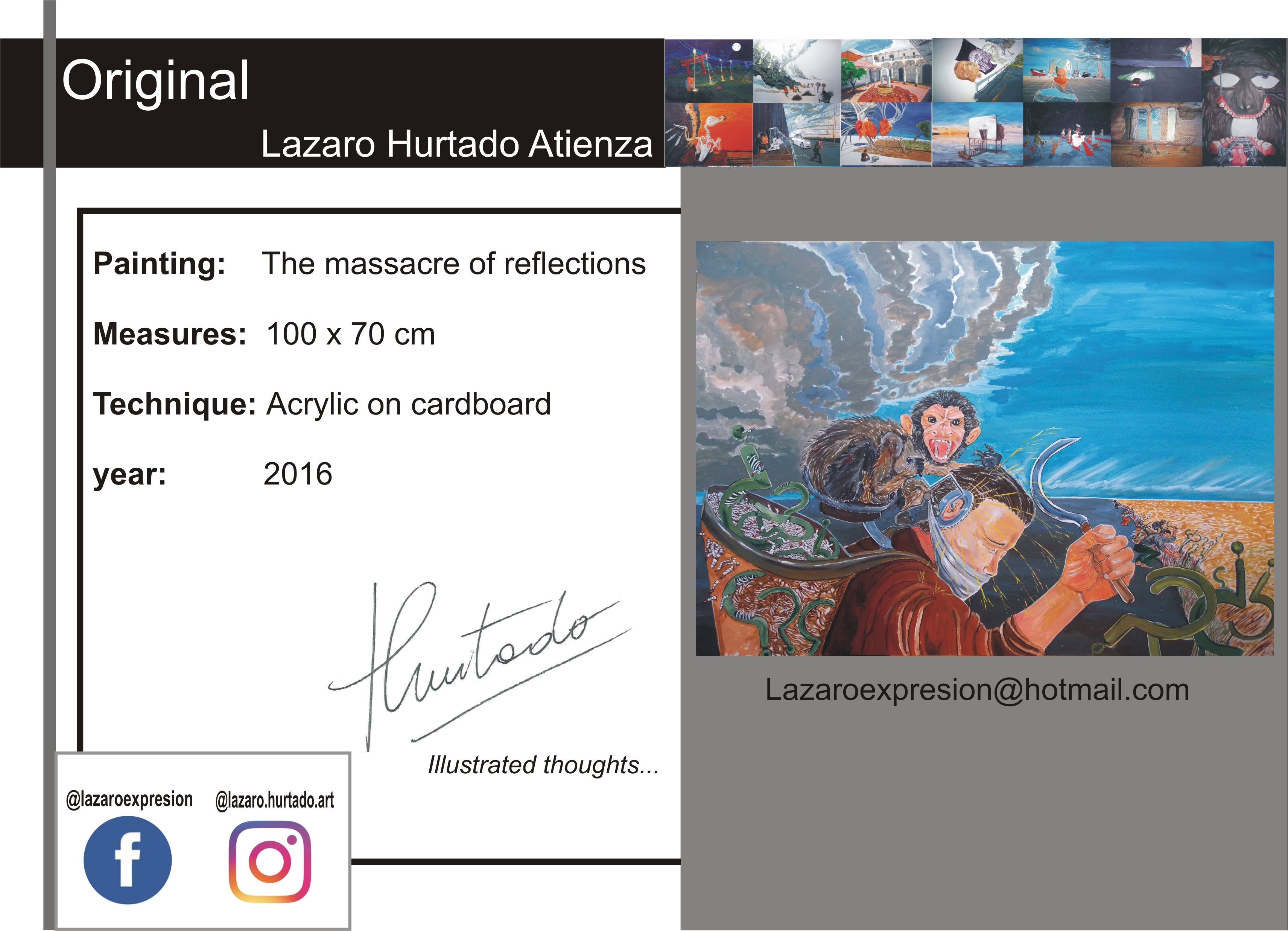 Lázaro Hurtado is an argentinian artist currently living in Buenos Aires, Argentina, were he works .Graduate Fine arts “ Bachillerato de Bellas Artes “ affiliated National University of La Plata. He states than more than an artist, he is a thinker.His work born from the necesity of expressing thoughts and conceptions of the World that surrounds him. The images he offers us project humanistic messages, the nature of mankind, the possible and the ridiculous. He makes comments about reality and the social forces and orders, but at the same time he demostrates a playful face, ironic in some cases. The transcription of inner alchemies into paintings of surrealist character wakes a curiosity in the viewer. The spectators would often find themselves been tickle by the ideas and concepts on reality and human behaviour that he seems to contemplate and rebuilt on his mind. The images you see are the working mechanics of a brain on a mind made world... Media: www.facebook.com/lazaroexpresion http://lazaro-hurtado.pixels.com http://www.redbubble.com/people/lazarohurtado https://twitter.com/lazaroexpresion 2019 _ Bio-Art Contest winner Excellence Prize . Seoul, South korea _ Premios a la Creación Artistica. Universidad de Belgrano. 27° Edición. Buenos Aires 2018 _ Artplu and Artron Art Auction: Western Modern & Contemporary Art _Picturesque Hotel . Wuxi, China 2017 _ X-Power Gallery Taipei . Taiwan _ Shenzhen International Art Fair. China _ Secoo 707 Deco Art Festival. China _ Artplu & Yidian China Art Auction:Western Contemporary Art Auction. China _ Art Nanjing- Baijiahu Art Mansion. China _ Art revolution Taipei 2017. Taiwan _ Get Art Museum Taipei, Taiwan 2016 _ Eggo Art Fair . Buenos Aires. _ ‘Thoughts’ curated by Tintin Yue JCCAC . Hong Kong _ 22 Salon de Pintura Palermo Viejo. Newbery Central Gallery. _ ‘Out of Gallery’ Hilton Hotel. Nanjin City. China _ Art Suning Plaza Collective Exhibition China _ Exposition at School Freud Lacan La Plata . Argentina 2015 _ Premio a la Creación Artística Universidad de Belgrano Buenos Aires _ Ar(t)gentina and Friends Castello Di Coazzolo (AT) Piemonte Italy _ Ar(t)gentina and Friends Pinacoteca Civica Camo ? Museo di Camo (CN) Piemonte Italy _ Ar(t)gentina and Friends Badnight Café Temporary Home Art Gallery Turín Italy _ ‘Illustrated thoughts’ Instituto de Capacitación Política. Argentina _ Museum of Contemporary Art, Artplu Shanghái, China _ 'Art on the Clouds', The Blue Skyline, Camphorwood, Wuxi City, China. _ " VIDEO KILLED THE ART STAR #2 "Spazio Arte 24, Via Corte 24, Dogliani Italy _ Tokyo International Art Fair Digital showcase Quest Hall Harajuku , Tokyo, Japan . _ Art Revolution Taipei 2015 Taiwan _ Arte La Plata stand unipersonal Argentina _ ‘ Colours of the World’ International Collective Exposition Bellas Artes. Museum And Academy., Bs As Argentina _ Motor Village Gallery City of Turin. Italy_ _ "il colori latini nell'arte contemporanea" Mondovi Piazza City of Mondovi, Cuneo, Italy 2014 _ ‘Becoming Conscience’ Cultural Centre Islas Malvinas Bs.As. Argentina _ 160th Stock Market Anniversary Buenos Aires. Argentina _ 1st Salón Municipal de Ilustration .La Plata . Argentina _ That Damned Show Detroit 2014 with a fineart canvas print ‘Lost sometimes’ USA