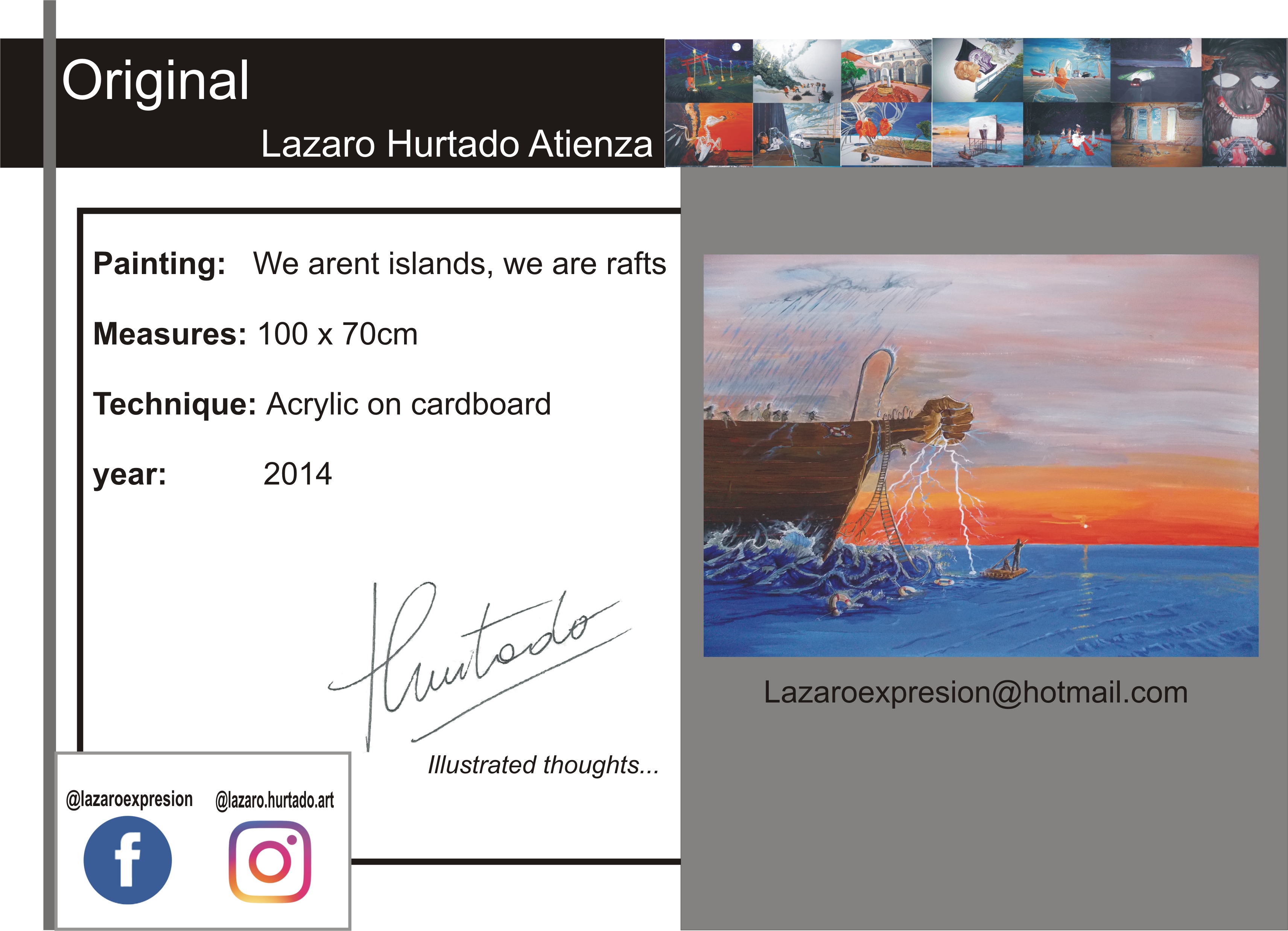 Lázaro Hurtado is an argentinian artist currently living in Buenos Aires, Argentina, were he works .Graduate Fine arts “ Bachillerato de Bellas Artes “ affiliated National University of La Plata. He states than more than an artist, he is a thinker.His work born from the necesity of expressing thoughts and conceptions of the World that surrounds him. The images he offers us project humanistic messages, the nature of mankind, the possible and the ridiculous. He makes comments about reality and the social forces and orders, but at the same time he demostrates a playful face, ironic in some cases. The transcription of inner alchemies into paintings of surrealist character wakes a curiosity in the viewer. The spectators would often find themselves been tickle by the ideas and concepts on reality and human behaviour that he seems to contemplate and rebuilt on his mind. The images you see are the working mechanics of a brain on a mind made world... Media: www.facebook.com/lazaroexpresion http://lazaro-hurtado.pixels.com http://www.redbubble.com/people/lazarohurtado https://twitter.com/lazaroexpresion 2019 _ Bio-Art Contest winner Excellence Prize . Seoul, South korea _ Premios a la Creación Artistica. Universidad de Belgrano. 27° Edición. Buenos Aires 2018 _ Artplu and Artron Art Auction: Western Modern & Contemporary Art _Picturesque Hotel . Wuxi, China 2017 _ X-Power Gallery Taipei . Taiwan _ Shenzhen International Art Fair. China _ Secoo 707 Deco Art Festival. China _ Artplu & Yidian China Art Auction:Western Contemporary Art Auction. China _ Art Nanjing- Baijiahu Art Mansion. China _ Art revolution Taipei 2017. Taiwan _ Get Art Museum Taipei, Taiwan 2016 _ Eggo Art Fair . Buenos Aires. _ ‘Thoughts’ curated by Tintin Yue JCCAC . Hong Kong _ 22 Salon de Pintura Palermo Viejo. Newbery Central Gallery. _ ‘Out of Gallery’ Hilton Hotel. Nanjin City. China _ Art Suning Plaza Collective Exhibition China _ Exposition at School Freud Lacan La Plata . Argentina 2015 _ Premio a la Creación Artística Universidad de Belgrano Buenos Aires _ Ar(t)gentina and Friends Castello Di Coazzolo (AT) Piemonte Italy _ Ar(t)gentina and Friends Pinacoteca Civica Camo ? Museo di Camo (CN) Piemonte Italy _ Ar(t)gentina and Friends Badnight Café Temporary Home Art Gallery Turín Italy _ ‘Illustrated thoughts’ Instituto de Capacitación Política. Argentina _ Museum of Contemporary Art, Artplu Shanghái, China _ 'Art on the Clouds', The Blue Skyline, Camphorwood, Wuxi City, China. _ " VIDEO KILLED THE ART STAR #2 "Spazio Arte 24, Via Corte 24, Dogliani Italy _ Tokyo International Art Fair Digital showcase Quest Hall Harajuku , Tokyo, Japan . _ Art Revolution Taipei 2015 Taiwan _ Arte La Plata stand unipersonal Argentina _ ‘ Colours of the World’ International Collective Exposition Bellas Artes. Museum And Academy., Bs As Argentina _ Motor Village Gallery City of Turin. Italy_ _ "il colori latini nell'arte contemporanea" Mondovi Piazza City of Mondovi, Cuneo, Italy 2014 _ ‘Becoming Conscience’ Cultural Centre Islas Malvinas Bs.As. Argentina _ 160th Stock Market Anniversary Buenos Aires. Argentina _ 1st Salón Municipal de Ilustration .La Plata . Argentina _ That Damned Show Detroit 2014 with a fineart canvas print ‘Lost sometimes’ USA