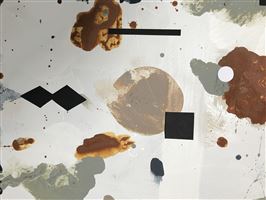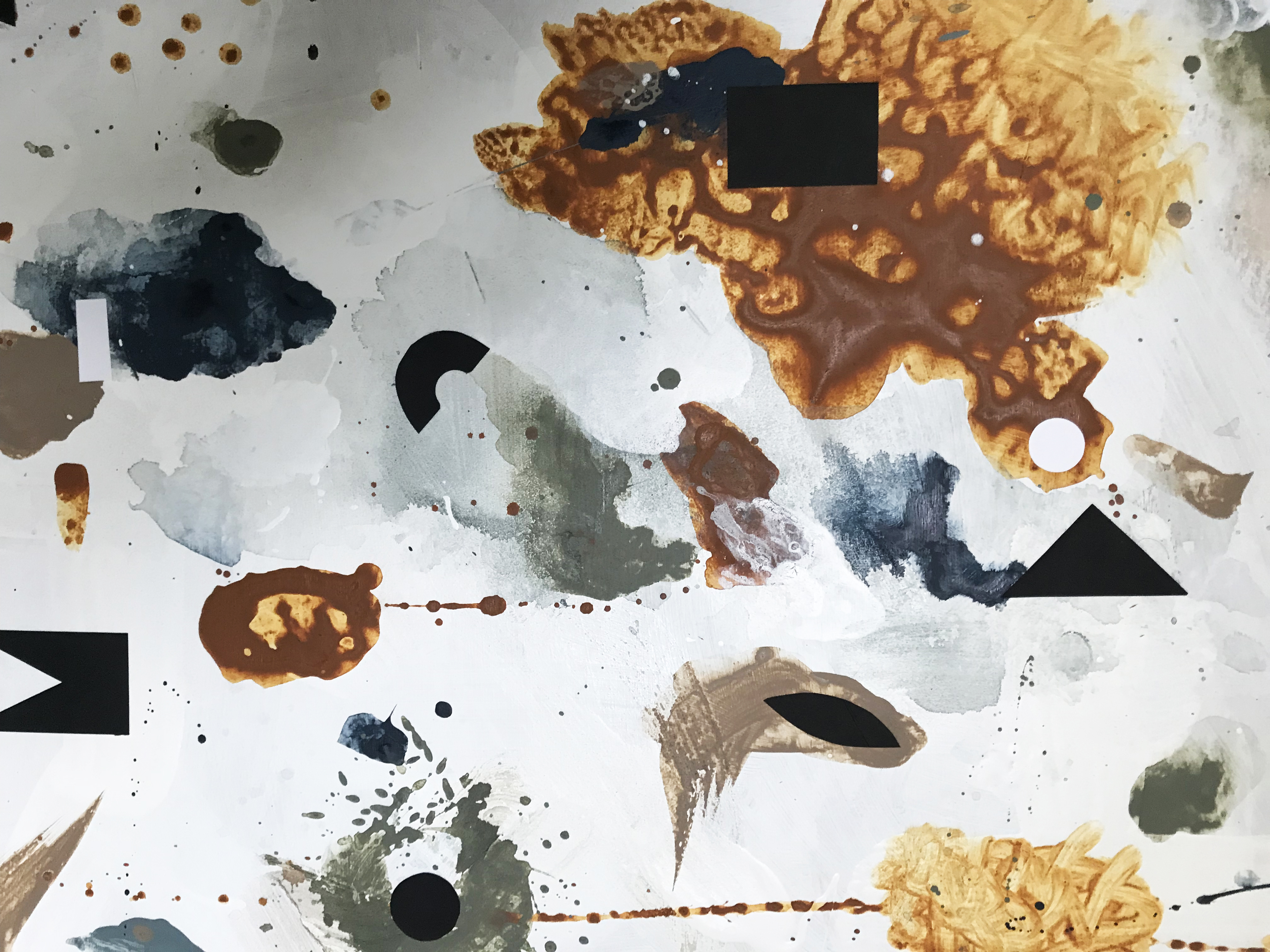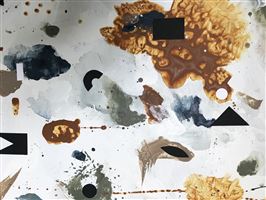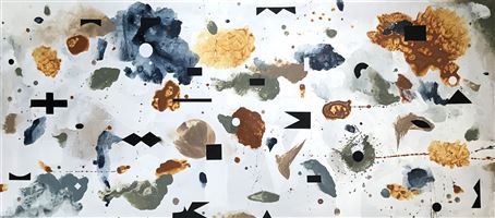 THE COMPOSITION IS IN BLUE AND GOLD TONES WITH CLEAR BLACK SHAPES.