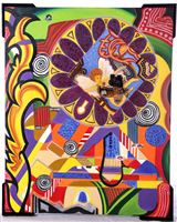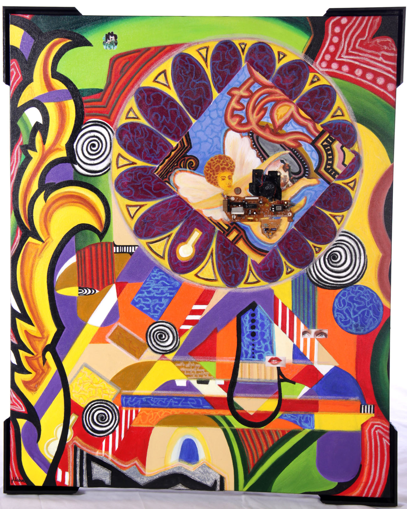 ASSEMBLAGE WITH CUBIST INFLUENCE AND TRACES OF ART HISTORY SUCH AS THE BAROQUE, SURREALISTIC COLLAGES FROM DALI, GREEK ART, AND COLLAGES OF FOUND OBJECTS FROM COMPUTER SCRAPS AND OTHERS .THE WORK IS THE DECONSTRUCTION OF A TELEPHONE MATERIAL WHERE I DRAW A DIALOGUE BETWEEN CUBISM AND OTHER ARTISTIC MOVEMENTS AS MENTIONED PREVIOUSLY. DIALOGUE IS PRECISELY THE TRAJECTORY I MAKE WITH THE JUXTAPOSITION OF ARTISTIC STYLES AND WITH STRONG INFLUENCE OF THE COMPLEMENTARY COLORS. THE WORK IS INFLUENCED BY MY ART HISTORY CLASSES THAT I TEACH IN THE STATE OF SÃO PAULO WHERE I PLAY IN A PLAYFUL AND RELAXED TONE WITH COLORS AND HISTORY.