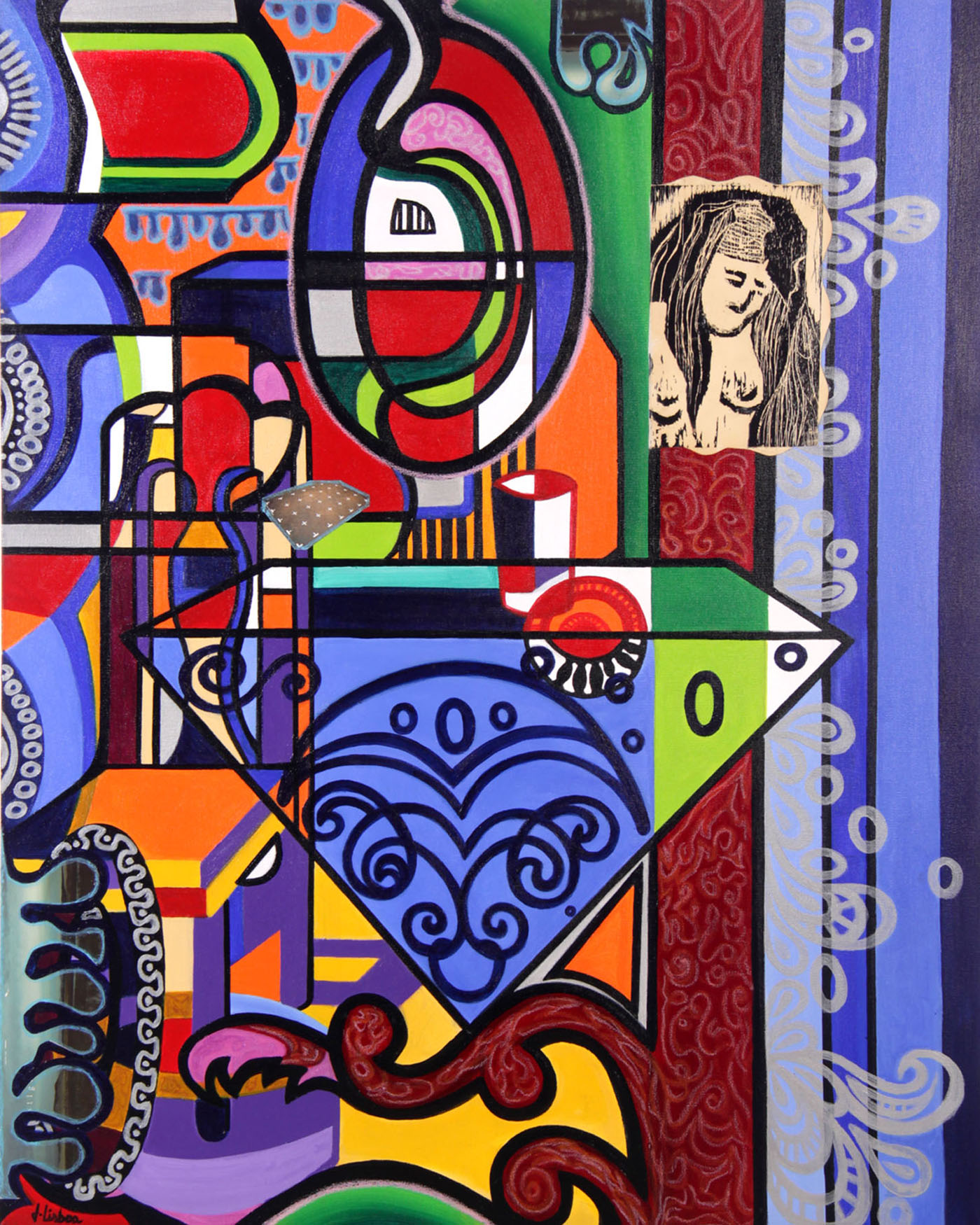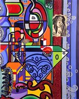 The work was created with a subtle cubist influence and cutting of cards and woodcut. The work is a deconstruction of objects of my daily life as a table, chair, television, in a moment of great intensity in the city of Rio de Janeiro when I watch on TV - army invasion in the several hills of the city. There is also a collage of an artist's work from the time of the military dictatorship in Brazil criticizing it and crying for freedom. Woodcut on the canvas of a sad character is nothing more than the portrait of the anguish of the most difficult moments that we live and the predominant colors on the screen are the complementary colors juxtaposed.