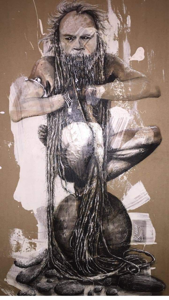 I HAVE DREADLOCKS MYSELF AND I WOULD RATHER OFFER UP A LIMB THAN CUT OFF MY LOCKS… I KNOW, IT'S A CRAZY THOUGHT (EVEN THOUGH IT'S ONLY HYPOTHETICAL) BUT WHY DO I HAVE SUCH A HUGE ATTACHMENT TO MY HAIR? IT DOES GROW BACK AFTER ALL… IS IT PURELY A MATTER OF AESTHETICS OR IS IT THE FACT THAT I'VE SPENT SO MANY YEARS GROWING THEM? OR IS THERE SOMETHING MORE TO THIS UNNECESSARY ATTACHMENT? ASIDE FROM THE BIBLICAL STORY OF SAMSON, I HAVE LEARNT THAT MANY ANCIENT TRIBES WERE OF THE BELIEF THAT BODILY, MENTAL AND SPIRITUAL ENERGIES MAINLY EXIT THE BODY THROUGH THE TOP OF THE HEAD AND HAIR. IF THE HAIR IS KNOTTED, THEY BELIEVE THE ENERGY REMAINS WITHIN THE HAIR AND BODY, KEEPING A PERSON STRONGER AND HEALTHIER. IN THIS PIECE I HAVE DRAWN AN ELDERLY MAN PERCHED ON A BOULDER IN A CHALLENGING MEDITATION POSITION, WITH FLOOR SCRAPING DREADLOCKS. I IMAGINED THIS TO EXPRESS THE POWER OF AN ELDERLY MAN AS A SPIRITUAL LEADER WHO CAN STAY IN THIS POSITION FOR AN EXTENDED PERIOD OF TIME BECAUSE, AFTER ALL, MERIRI KE MATLA.