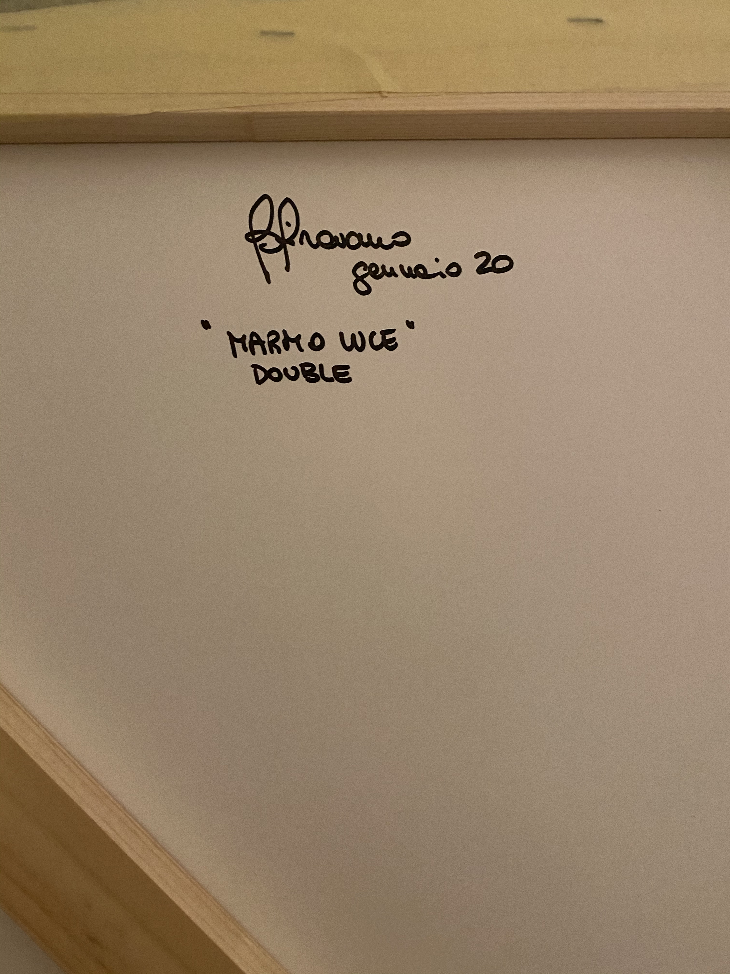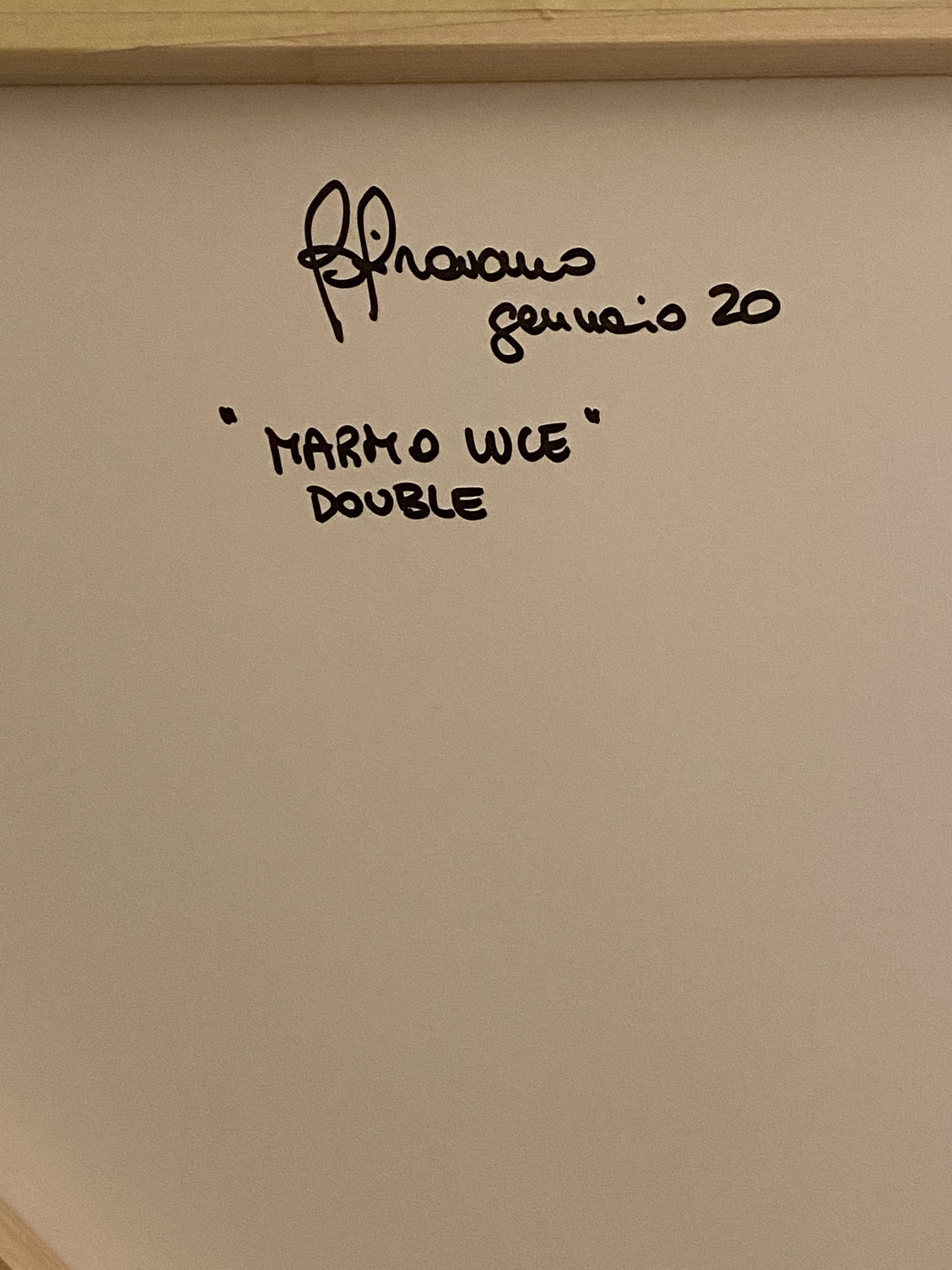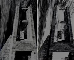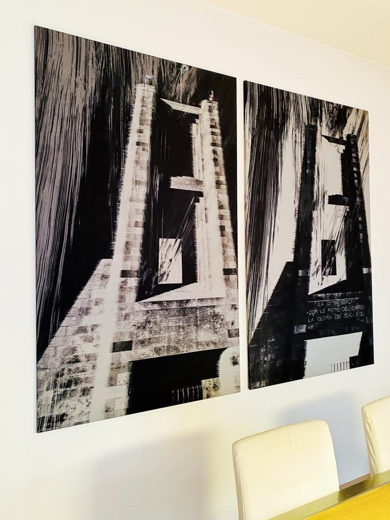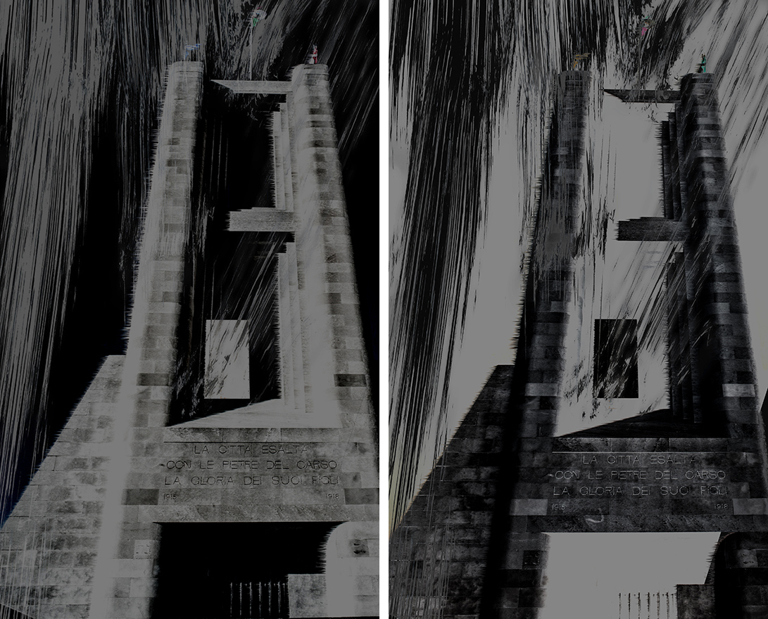 OVERLAPS OF PHOTOS, LIGHT AND SCRATCH REPRESENTING THE MEMORIAL BUILD BY GIUSEPPE TERRAGNI AND ANTONIO SANT'ELIA. PRINTED ON SILK AND FRAMED ON WOOD