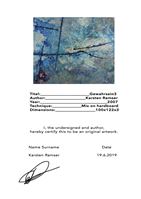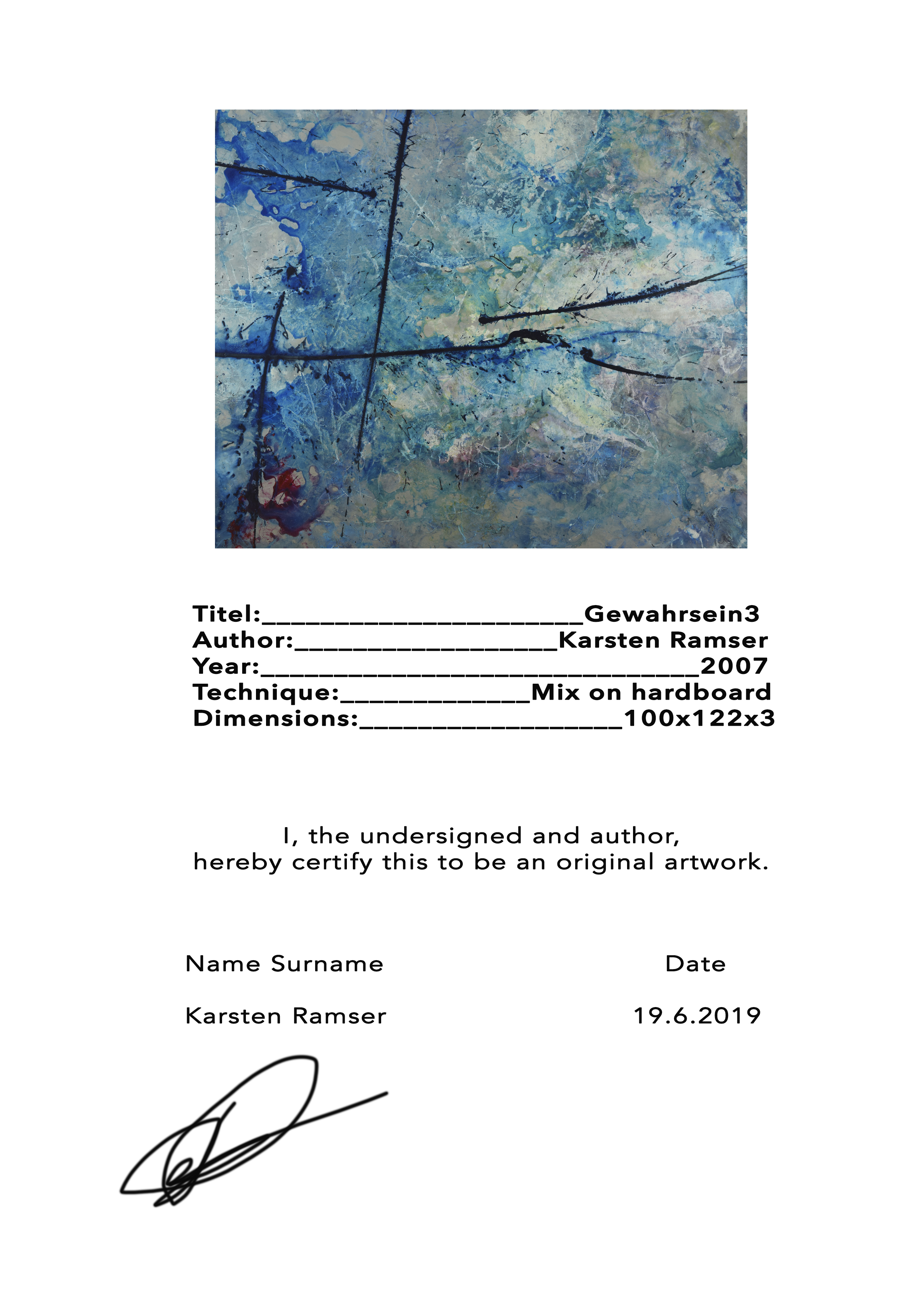 GEWAHRSEIN IS A GERMAN WORD, THE DIRECT TRANSLATION IS AWARENESS. BUT THE WORD GEWAHRSEIN HAS A WIDER MEANING. “GEWAHR” WE CAN ACTUALLY TRANSLATE AS “AWARE”, “WAHR” MEANS “TRUE” AND “SEIN” MEANS “TO BE” OR “BEING”. IN THIS WORK THE WORD GEWAHRSEIN IS USED IN THE WAY; TO BE AWARE OF THE TRUE BEING. TRUE BEING IN THE SENSE OF BEING TOTALLY PRESENT AND NOT IN THE SENSE OF DUALITY. EVEN WHEN ITS IMPOSSIBLE TO SAY WHEN A ARTWORK BEGINS, THE GEWAHRSEIN PAINTING ARE MY FIRST WORK OF CONSCIOUS ART. THE PREVIOUS WORKS HAD STILL A PERSONAL BACKGROUND AND THE “PERSONAL I” WAS STILL THE CENTER OF THE WORK. IT IS IMPOSSIBLE TO SAY WHAT IS THE MEANING OR INTENTION OF THESE PAINTINGS, THEY ARISES FROM A SPACE BEYOND THE PERSONAL IDENTITY. IT IS NOT AN ABSTRACTION OF SOMETHING, IT IS PURE “ FROZEN” GEWAHRSEIN. CREATING THIS WORK HAPPENS OUT OF EMPTINESS, OUT OF NOTHINGNESS. IN SOME MYSTERIOUS WAY WE CAN SAY IT IS THE IMPERSONAL SELF THAT BECAME VISIBLE. THERE IS NO NEED TO INTERPRET THESE PAINTINGS, JUST CONTEMPLATE THEN. THE MIND LOOKS “AUTOMATICALLY” FOR REFERENCE POINTS, BUT THEY EXIST ONLY IN THE MIND OF THE OBSERVER, THEY ARE NOT PART OF THE PAINTING, IN THE WHOLE PROCESS OF THE CREATION, THE “REFERENCE PATTERN” WAS INACTIVE. THERE WAS NO JUDGEMENT, ONLY NON-DOING [ EFFORTLESS ACTION ].