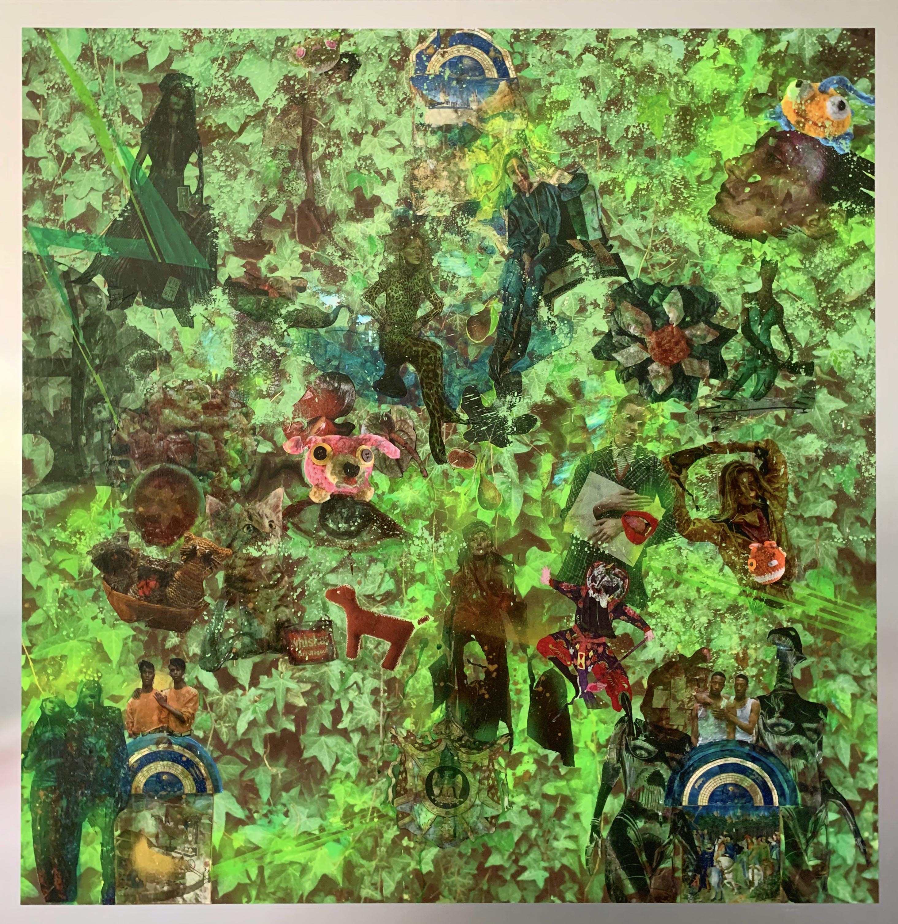 INK, ACRYLIC, GOUACHE, PHOTO FILM TRANSFER ON TRANSPARENCY MOUNTED ON ALUMINUM WITH SURROUNDING 5 CM FRAME. UNIQUE PIECE.