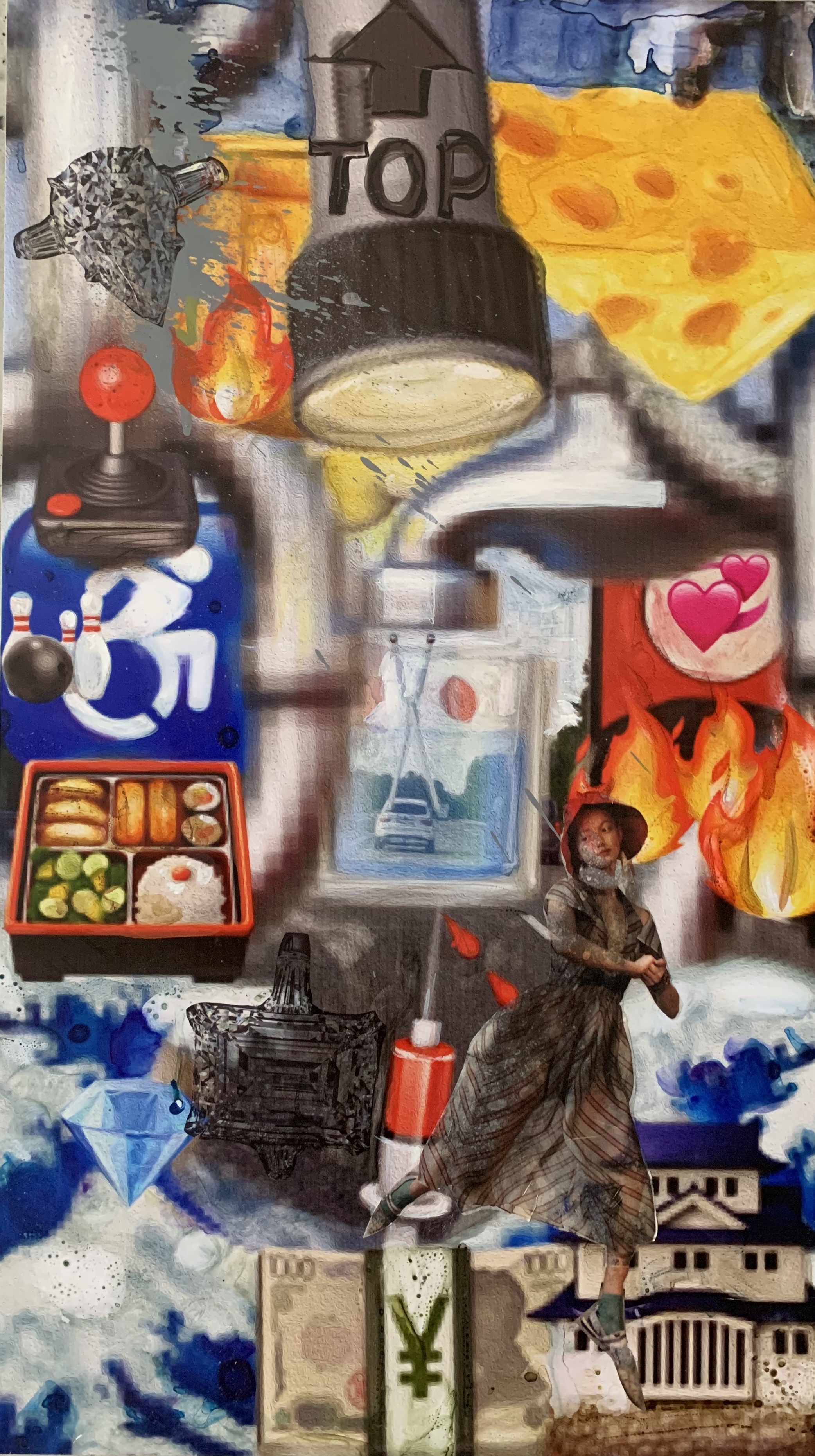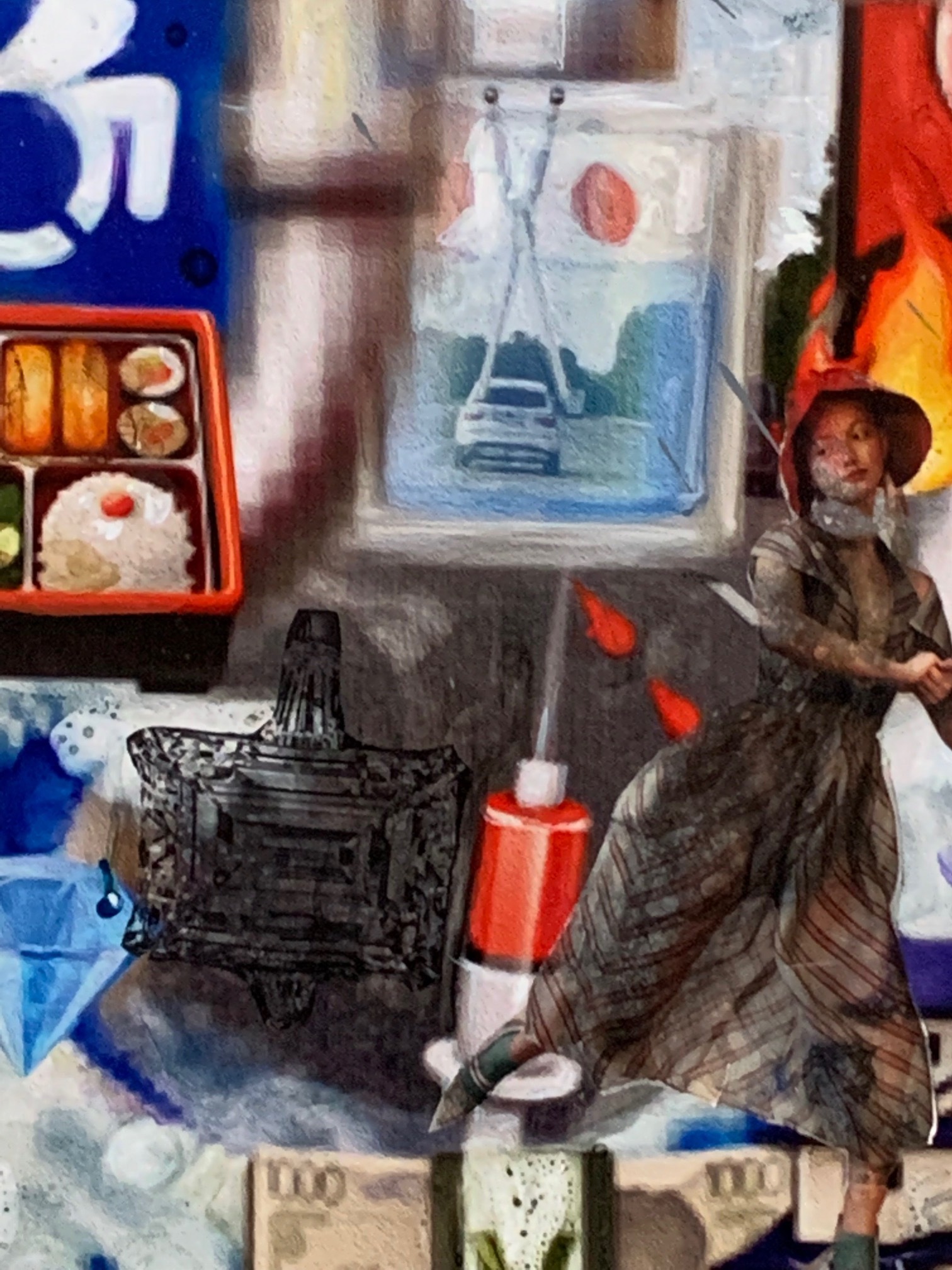 MIXED MEDIA (INK, ACRYLIC, GOUACHE, PHOTO FILM TRANSFER) ON PHOTO ROCKET PAPER MOUNTED ON ALUMINUM.