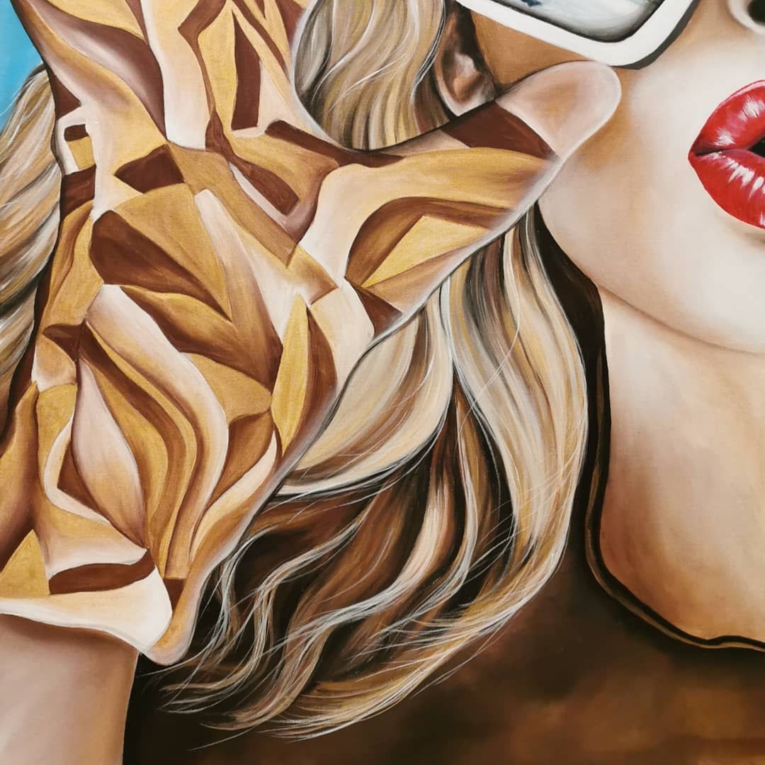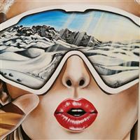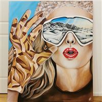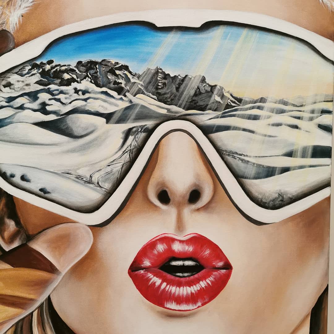 WOMAN CLOSE UP WITH MIRROR SKI GLASSES WITH REFLECTION OF THE BRENTA DOLOMITES