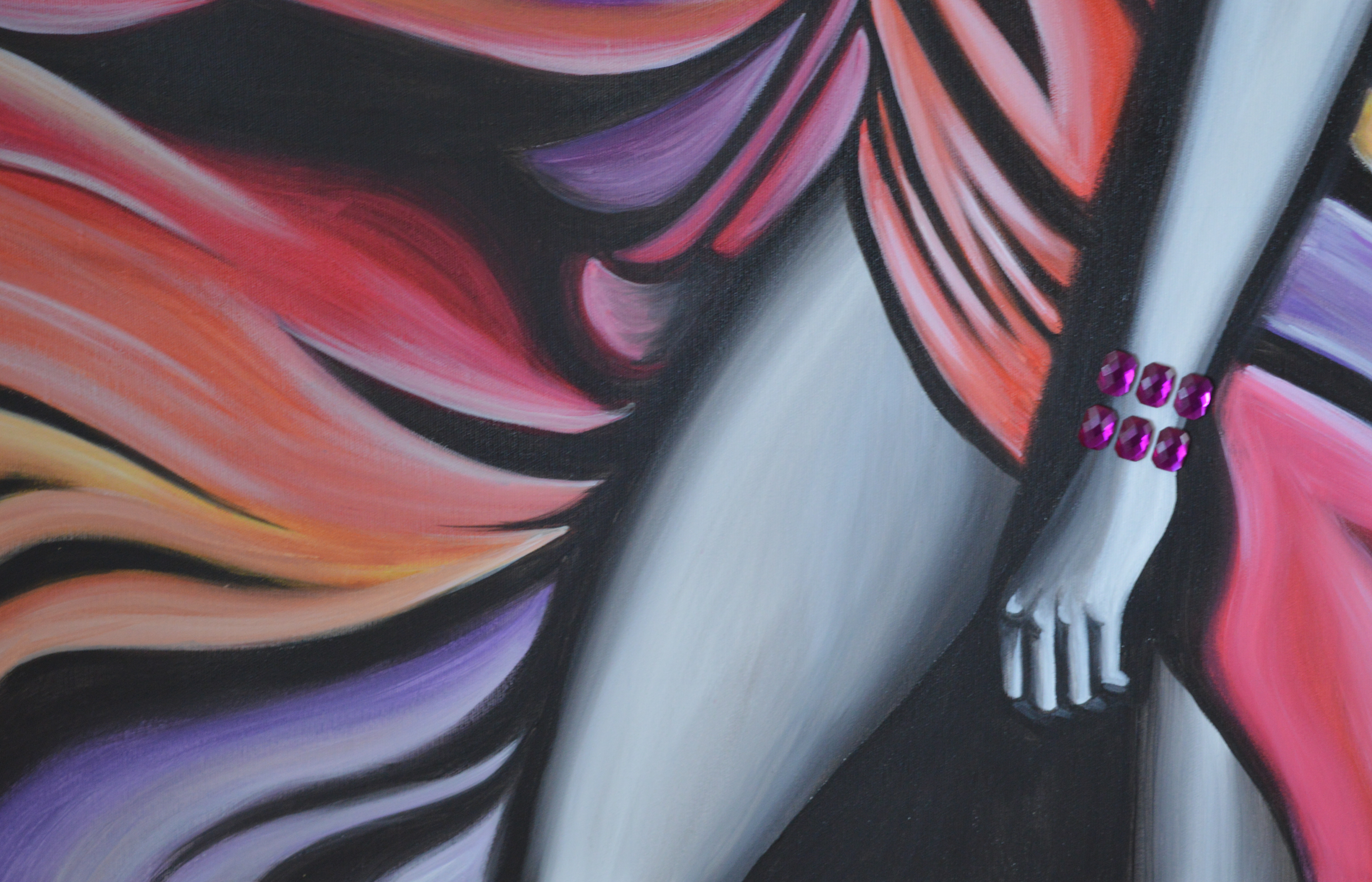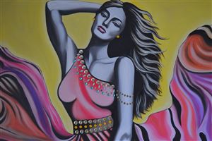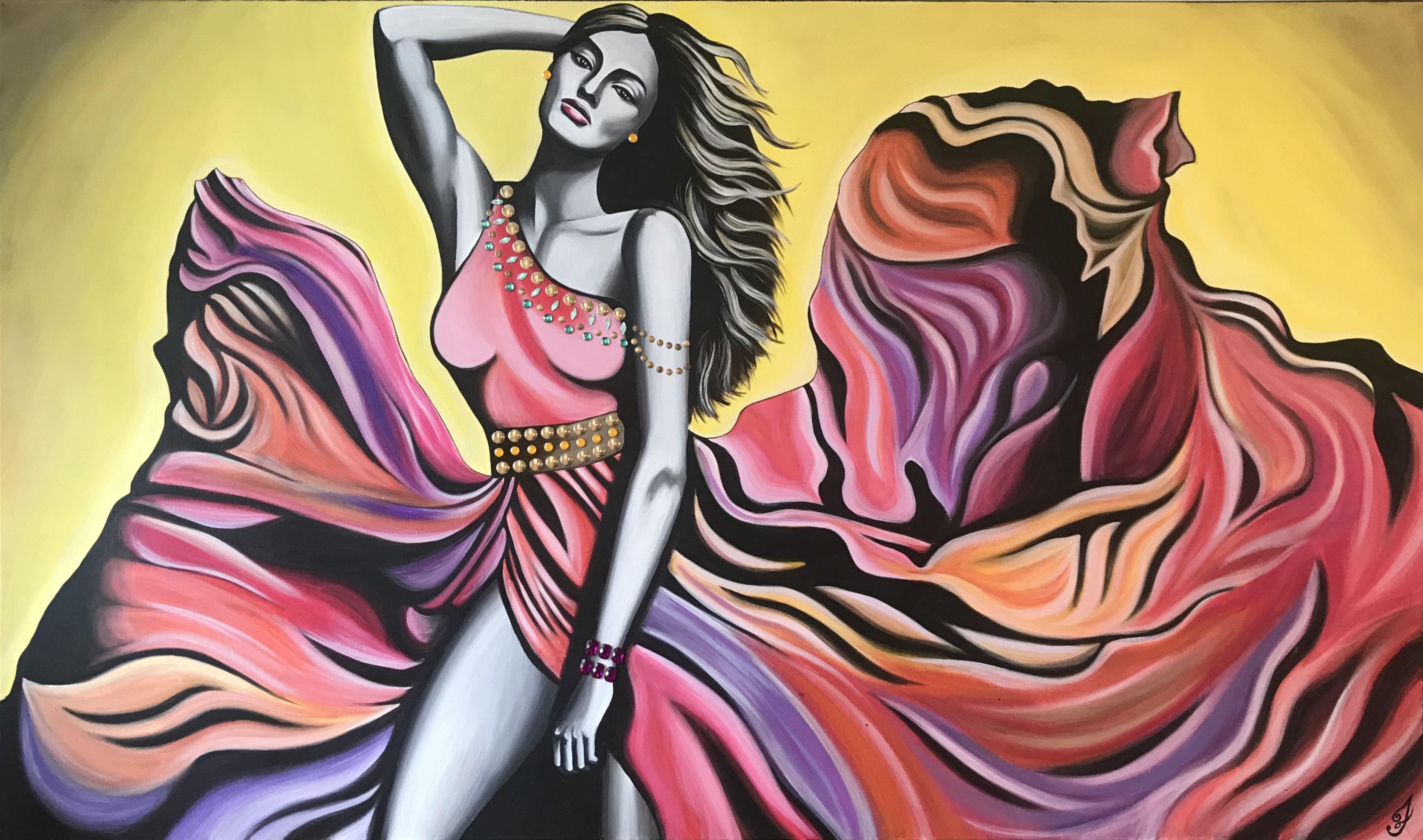 FIGURA FEMMINILE CON ABITO COLORATO MOSSO DAL VENTO. FORME E VOLUMI DETTATI DA TONI DIFFERENTI DI COLORE E SFUMATURE ACCENTUATE. DETTAGLI DEL VESTITO REALIZZATI CON APPLICAZONI MATERICHE