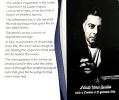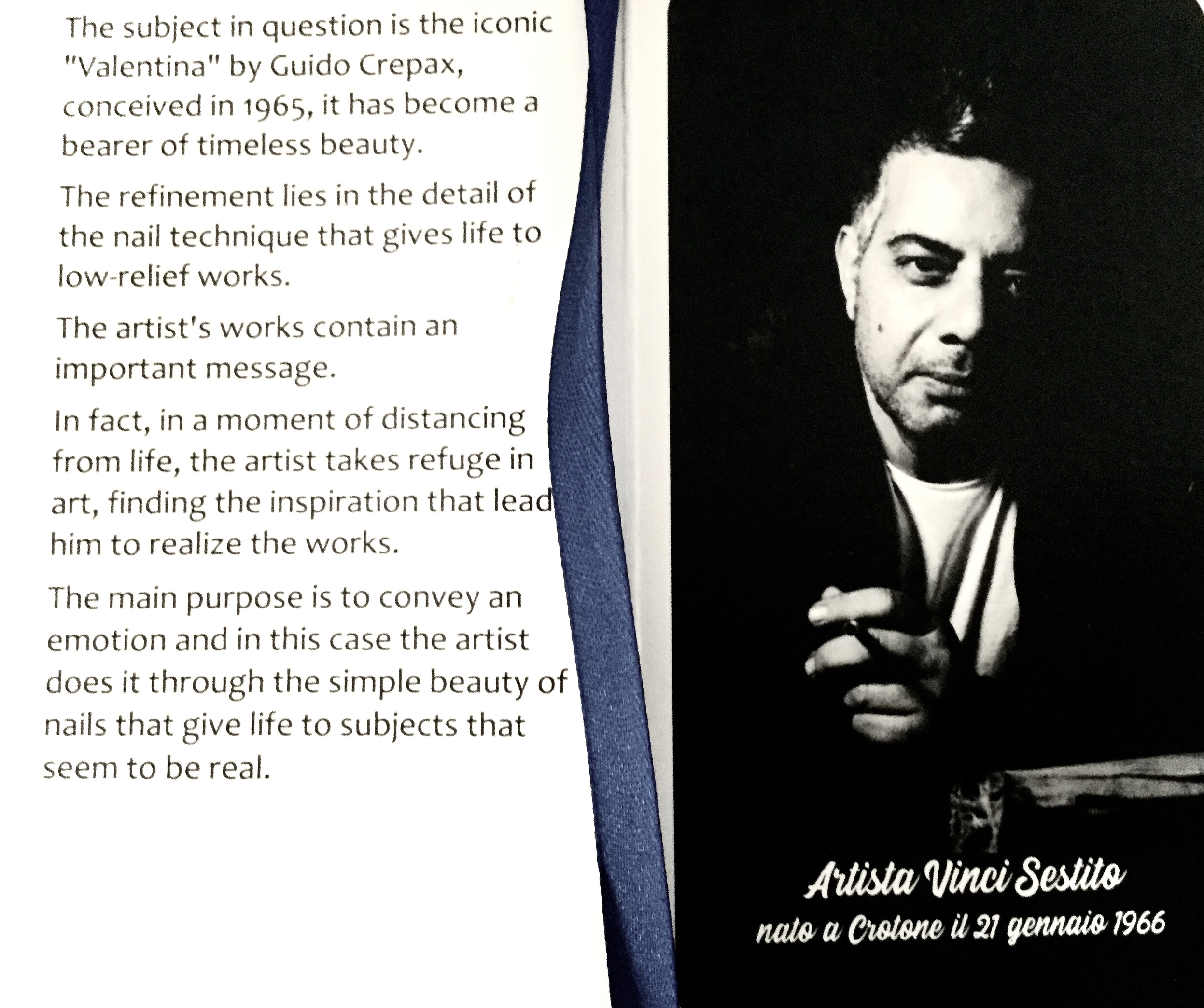 Artist Vincenzo Sestito, born in Crotone, Italy on 21.01.1966. As a child he became passionate about art, he experimented with brushes and pencils from an early age. His parents did not trust the young man, they believed it was only a frivolous and momentary passion, for this reason they did not give him the opportunity to enroll in artistic high school w for this reason they made him enroll in a technical high school with electronic address. In the 90s he worked for a large pharmaceutical company in Rome; but his desire to become an acclaimed artist did not subside in him. In 1995 his firstborn was born, who from birth and is still suffering from a spastic quadriparsi through neglect of the gynecologist. Art was the outlet for concentrating his sufferings and transforming them into artistic expressions. He made a trip that marked him, in Cesena, where he met a mosaic teacher. From here began his long artistic journey. The person who gave him strength and inspiration was Gaspare da Brescia. This friendship changed him a lot. Together with his friend they furnished a wellknown Milanese restaurant '400'. From here Vincenzo started looking for furniture for many clubs and villas, not only in Italy but also in China and the United Kingdom. After several years he concentrated on another artistic, innovative technique, the 'low relief with nails'. The protagonists of the works were mostly characters from Greek mythology, an important theme that recalls its own origins, as Crotone, his hometown, was one of the main, richest and strongest copies of Magnagrecia. His art and his works deviate from the usual, and stands out among these for the use of nails that allows you to play with light and shadow through the light-dark definitions thanks to the various colors and gradations of the nails. His latest 2017 \ 2019 collection is characterized by light and dark, and focuses on the designs of Valentina di Crepax, Satiri and Tani, the Lauconte di Troia, Mattanze di Tonni, Lupi, Civette and other characters who have left their mark in the artist. Artista Vincenzo Sestito, nato a Crotone, Italia il 21\01\1966. Da piccolo si appassiona all’arte, si cimentò fin dalla tenera età tra pennelli e matite. I suoi genitori non diedero fiducia al giovane, credevano fosse solo una passione frivola e momentanea, per questo non diedero lui la possibilità di iscriversi al liceo artistico per questo lo fecero iscrivere in un liceo tecnico con indirizzo elettronico. Negli anni 90 lavorò per una grande azienda farmaceutica di Roma; ma il suo desiderio di diventare un artista acclamato non si placò in lui. Nel 1995 nacque la sua primogenita, la quale dalla nascita ed è tutt’oggi affetta da una tetraparsi spastica per negligenza del ginecologo. L’arte fu lo sfogo dove concentrare le sue sofferenze e trasformarle in espressioni artistiche. Fece un viaggio che lo segnò, a Cesena, dove conobbe un insegnante di mosaico. Da qui iniziò il suo lungo percorso artistico. La persona che gli diede forza e ispirazione fu Gaspare da Brescia. Questa amicizia lo cambiò molto. Insieme all’amico arredarono un noto locale milanese ‘il 400’. Vincenzo da qui iniziò a cercare opere d’arredo per molti locali e ville, non solo in Italia ma anche in Cina e Regno Unito. Dopo vari anni si concentrò su un’altra tecnica artistica, innovativa, il ‘basso rilievo con chiodi’. I protagonisti delle opere furono maggiormente personaggi della mitologia greca, tema importante che richiama le sue stesse origini, in quanto Crotone, sua città natale, fu una delle colonie portanti, più ricca e forte della Magnagrecia. La sua arte e le sue opere si discostano dalle solite, e risalta tra queste per l’utilizzo dei chiodi che permette di poter giocare con luci e ombre attraverso le definizioni chiaro-scure grazie alle varie colorazioni e gradazioni dei chiodi. La sua ultima collezione 2017\2019 è caratterizzata dal chiaro-scuro, e si concentra sui disegni di Valentina di Crepax, Satiri e Tani, il Lauconte di Troia, Mattanze di Tonni, Lupi, Civette e altri personaggi che hanno lasciato il segno nell’artista.