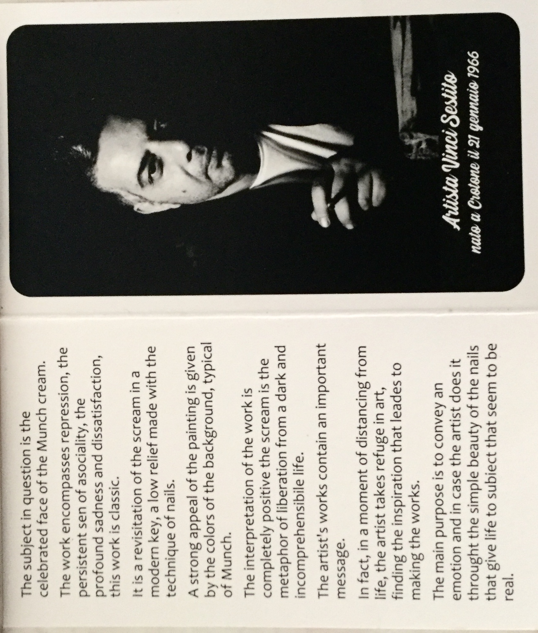 Artist Vincenzo Sestito, born in Crotone, Italy on 21.01.1966. As a child he became passionate about art, he experimented with brushes and pencils from an early age. His parents did not trust the young man, they believed it was only a frivolous and momentary passion, for this reason they did not give him the opportunity to enroll in artistic high school w for this reason they made him enroll in a technical high school with electronic address. In the 90s he worked for a large pharmaceutical company in Rome; but his desire to become an acclaimed artist did not subside in him. In 1995 his firstborn was born, who from birth and is still suffering from a spastic quadriparsi through neglect of the gynecologist. Art was the outlet for concentrating his sufferings and transforming them into artistic expressions. He made a trip that marked him, in Cesena, where he met a mosaic teacher. From here began his long artistic journey. The person who gave him strength and inspiration was Gaspare da Brescia. This friendship changed him a lot. Together with his friend they furnished a wellknown Milanese restaurant '400'. From here Vincenzo started looking for furniture for many clubs and villas, not only in Italy but also in China and the United Kingdom. After several years he concentrated on another artistic, innovative technique, the 'low relief with nails'. The protagonists of the works were mostly characters from Greek mythology, an important theme that recalls its own origins, as Crotone, his hometown, was one of the main, richest and strongest copies of Magnagrecia. His art and his works deviate from the usual, and stands out among these for the use of nails that allows you to play with light and shadow through the light-dark definitions thanks to the various colors and gradations of the nails. His latest 2017 \ 2019 collection is characterized by light and dark, and focuses on the designs of Valentina di Crepax, Satiri and Tani, the Lauconte di Troia, Mattanze di Tonni, Lupi, Civette and other characters who have left their mark in the artist. Artista Vincenzo Sestito, nato a Crotone, Italia il 21\01\1966. Da piccolo si appassiona all’arte, si cimentò fin dalla tenera età tra pennelli e matite. I suoi genitori non diedero fiducia al giovane, credevano fosse solo una passione frivola e momentanea, per questo non diedero lui la possibilità di iscriversi al liceo artistico per questo lo fecero iscrivere in un liceo tecnico con indirizzo elettronico. Negli anni 90 lavorò per una grande azienda farmaceutica di Roma; ma il suo desiderio di diventare un artista acclamato non si placò in lui. Nel 1995 nacque la sua primogenita, la quale dalla nascita ed è tutt’oggi affetta da una tetraparsi spastica per negligenza del ginecologo. L’arte fu lo sfogo dove concentrare le sue sofferenze e trasformarle in espressioni artistiche. Fece un viaggio che lo segnò, a Cesena, dove conobbe un insegnante di mosaico. Da qui iniziò il suo lungo percorso artistico. La persona che gli diede forza e ispirazione fu Gaspare da Brescia. Questa amicizia lo cambiò molto. Insieme all’amico arredarono un noto locale milanese ‘il 400’. Vincenzo da qui iniziò a cercare opere d’arredo per molti locali e ville, non solo in Italia ma anche in Cina e Regno Unito. Dopo vari anni si concentrò su un’altra tecnica artistica, innovativa, il ‘basso rilievo con chiodi’. I protagonisti delle opere furono maggiormente personaggi della mitologia greca, tema importante che richiama le sue stesse origini, in quanto Crotone, sua città natale, fu una delle colonie portanti, più ricca e forte della Magnagrecia. La sua arte e le sue opere si discostano dalle solite, e risalta tra queste per l’utilizzo dei chiodi che permette di poter giocare con luci e ombre attraverso le definizioni chiaro-scure grazie alle varie colorazioni e gradazioni dei chiodi. La sua ultima collezione 2017\2019 è caratterizzata dal chiaro-scuro, e si concentra sui disegni di Valentina di Crepax, Satiri e Tani, il Lauconte di Troia, Mattanze di Tonni, Lupi, Civette e altri personaggi che hanno lasciato il segno nell’artista.