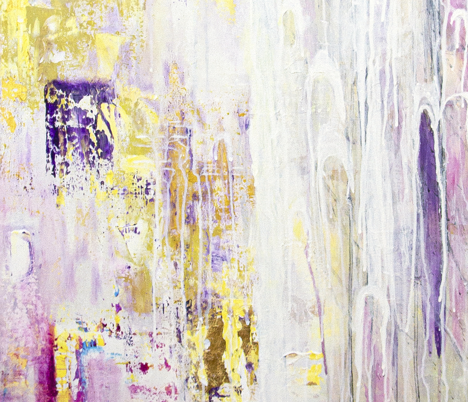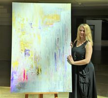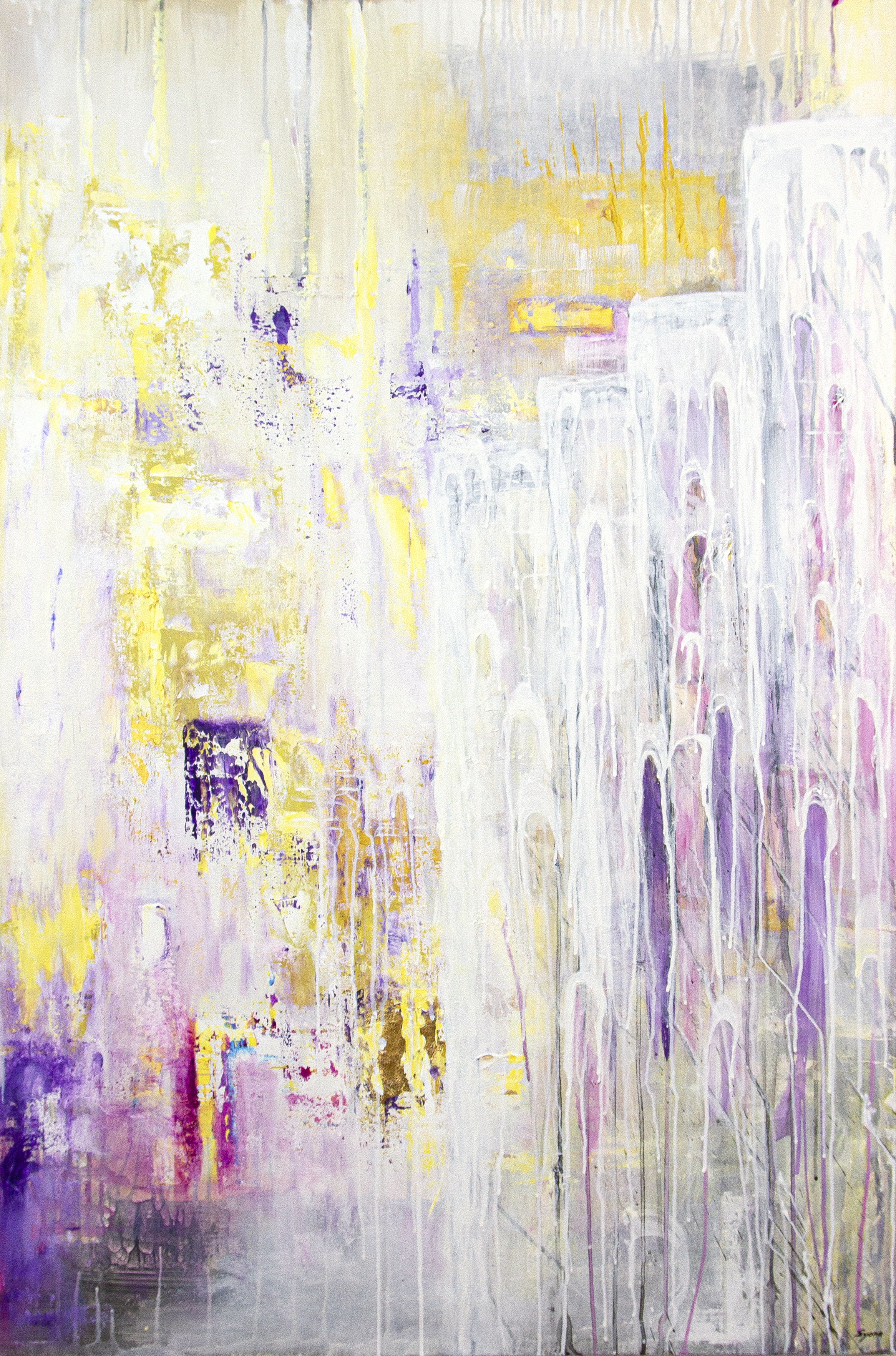 ACRYLIC AND GOLD LEAF ON CANVAS, 150X100X4 CM, FRONT-SIGNED, 2019 WATER, THIS PRIMORDIAL ELEMENT, IS THE SUBSTANCE OF BIRTH AND DEATH, OF WHICH ALL FORMS ARE BORN AND INTO WHICH ALL RETURN. THE WATER WAS IN THE BEGINNING AND IT RETURNS IN THE END OF EVERY COSMIC CYCLE. WITH POWERFUL GERMINATING AND PURIFYING FUNCTIONS, WATER SYNTHESIZE THE SENSE OF BEGINNING AND REGENERATION BY DISSOLVING, ERASING HISTORY. DARK MEMORIES (REPRESENTED BY THE GLOOMY, LAYERED SPACE ON THE BOTTOM LEFT OF THE PAINTING) CAN BE REWRITTEN THROUGH THE PROCESS OF PURIFICATION BY WATER, AND LEAD, STEP BY STEP, TO THE ASCENDED EVOLUTION OF LIGHT. SUCCESSIVE BRIDGES, A SIGN OF SUCCESSION OF LIFE, FROM ONE STAGE TO ANOTHER, FROM ONE INCARNATION TO ANOTHER, EMPHASIZE REGENERATION.