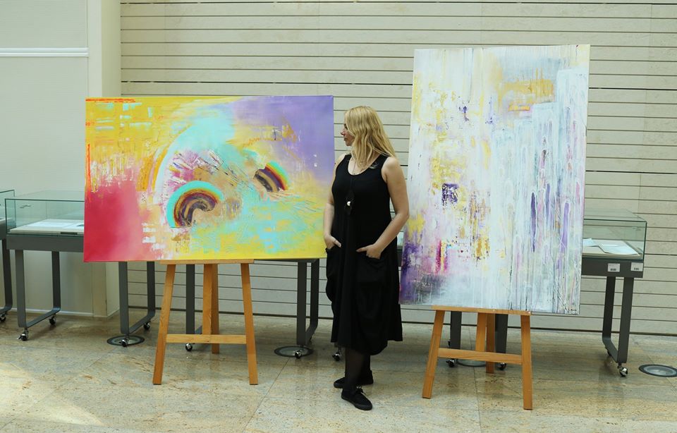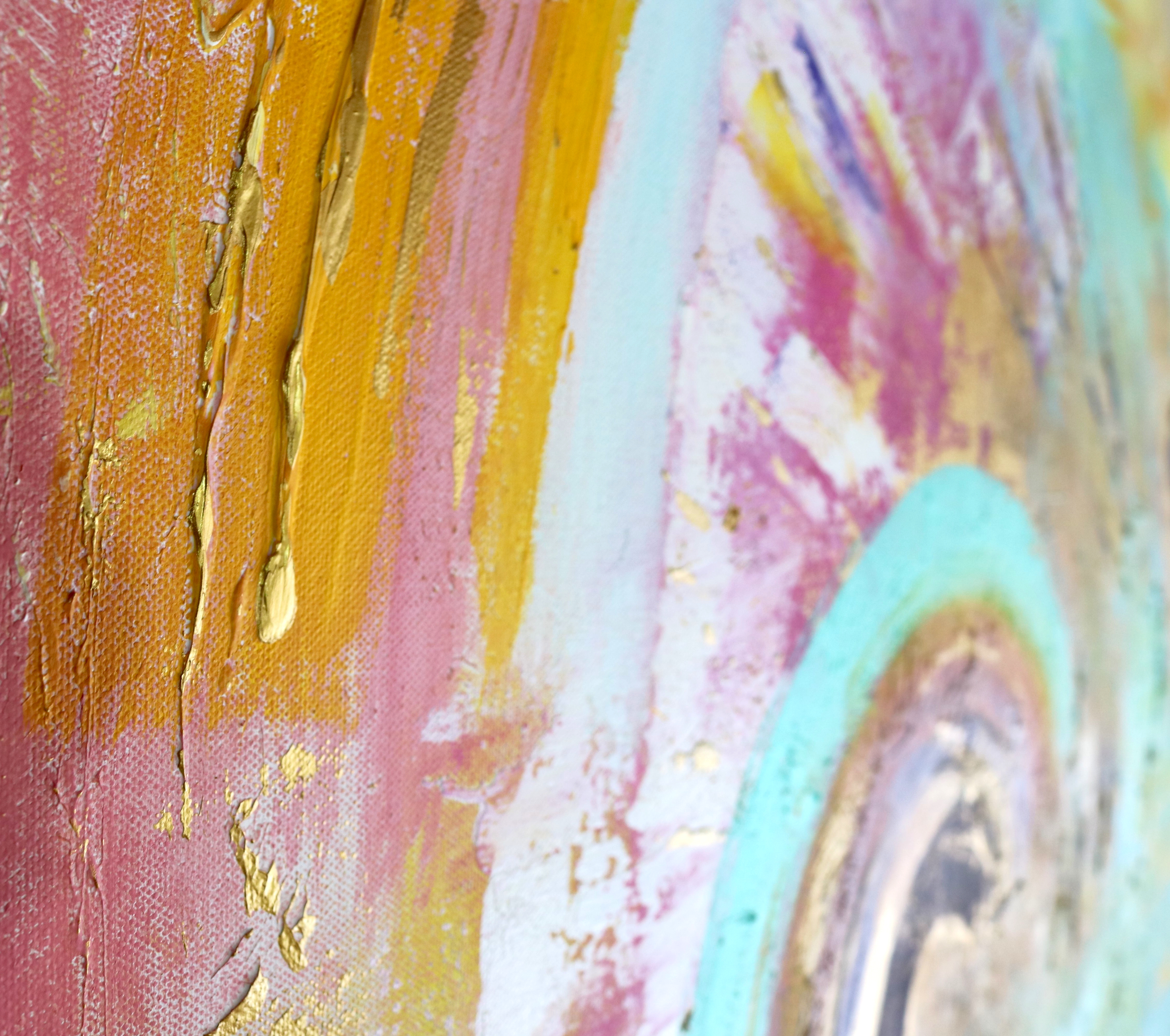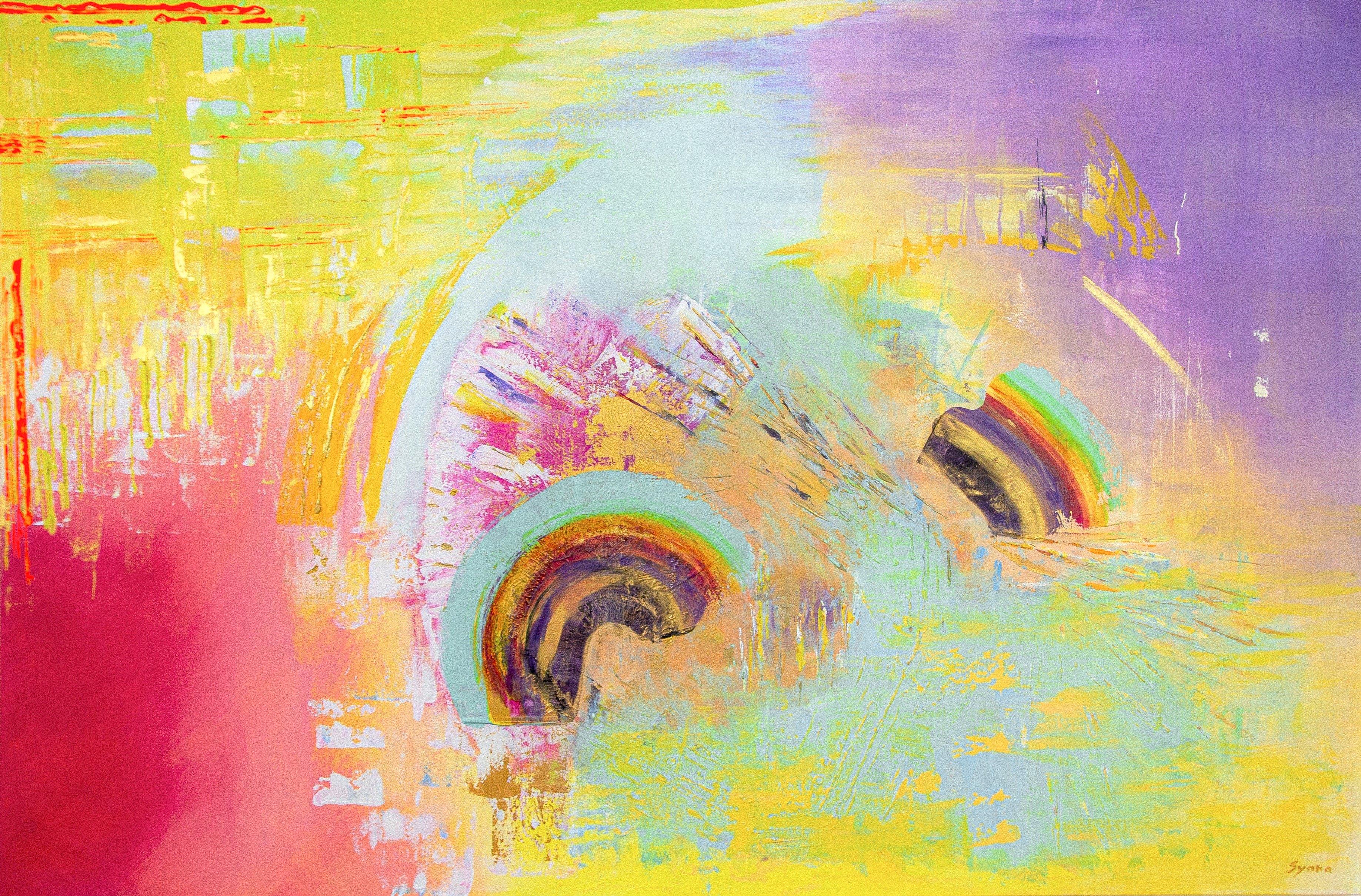 THE IDEA OF A RAINBOW BROKEN IN TWO IN AN EXPLOSION IS A METAPHOR OF JOY THAT "GUSHES", GIVING BIRTH TO ITSELF. THE RAINBOW IS A SYMBOL OF HOPE AND OPTIMISM, A BRIDGE TOWARDS ANOTHER DIMENSION WHERE THINGS ARE SEEN AND UNDERSTOOD FROM A SUPERIOR PERSPECTIVE.