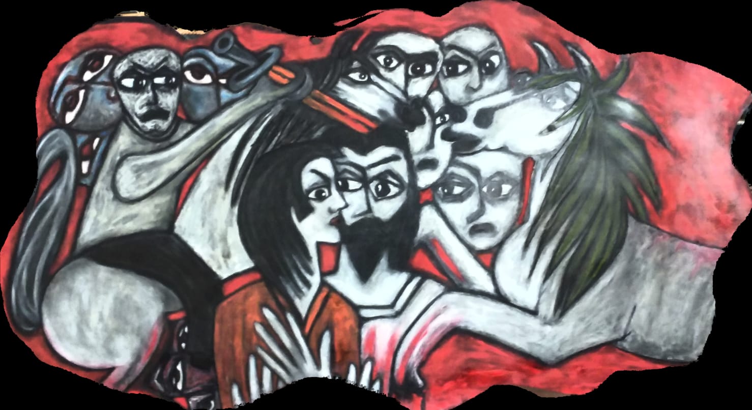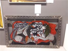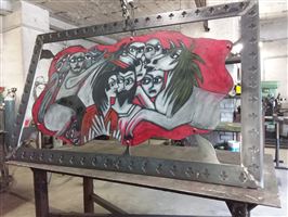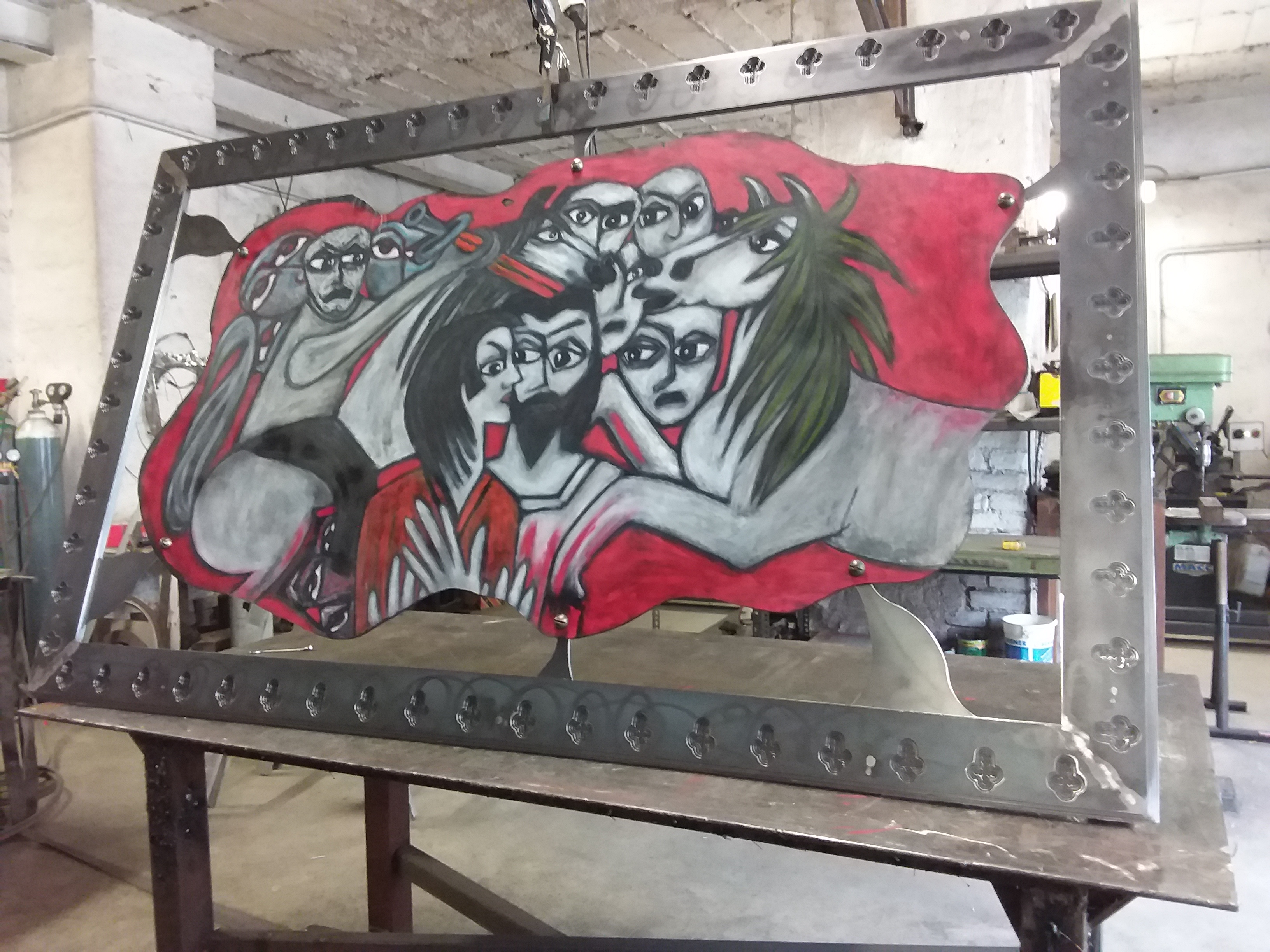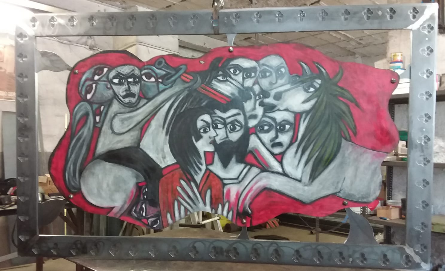 OPERA SU PELLE DI MUCCA CON LAVORAZIONE MANUALE A OLIO POSATA SU LEGNO INCASTONATA SU CORNICE FERRO BATTUTO