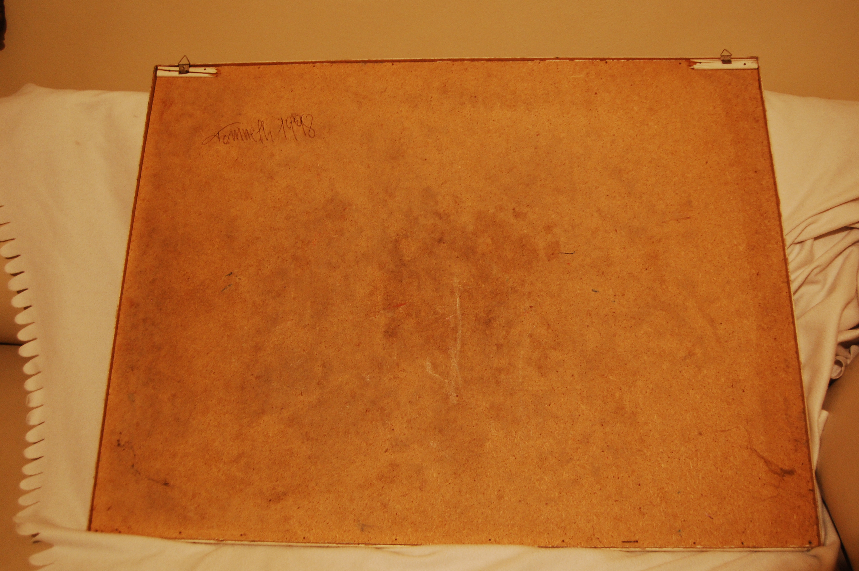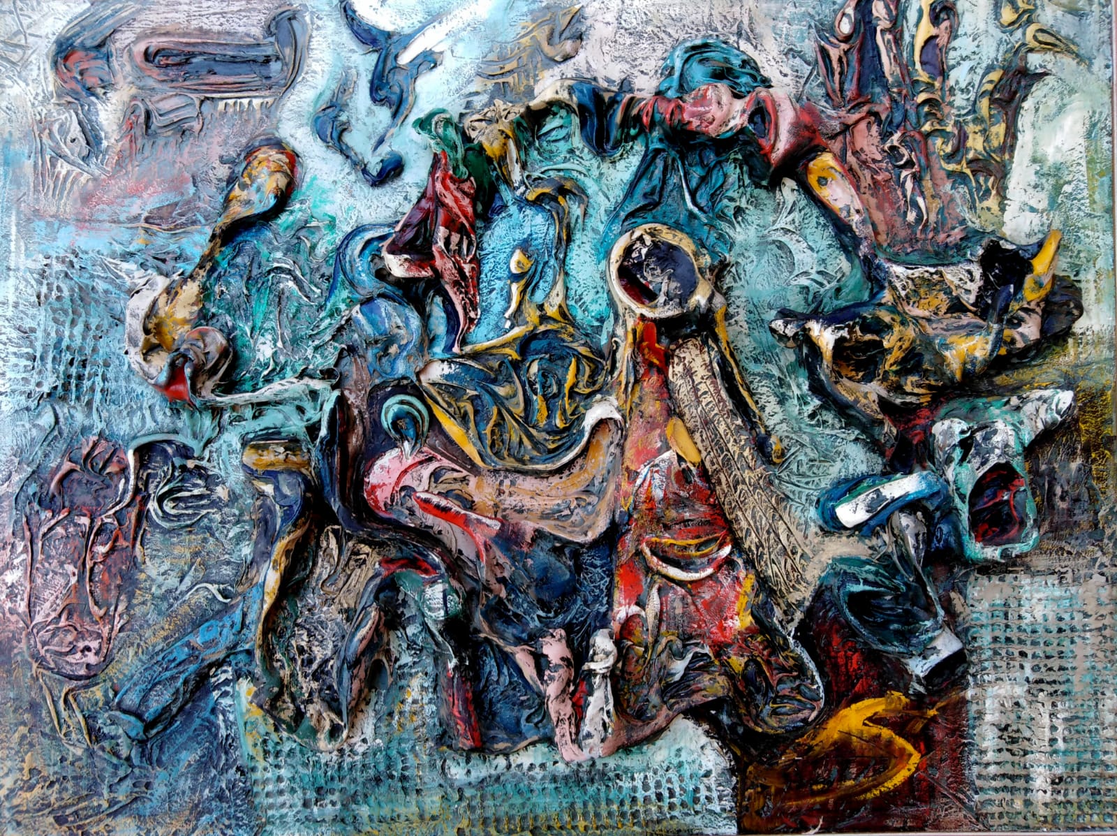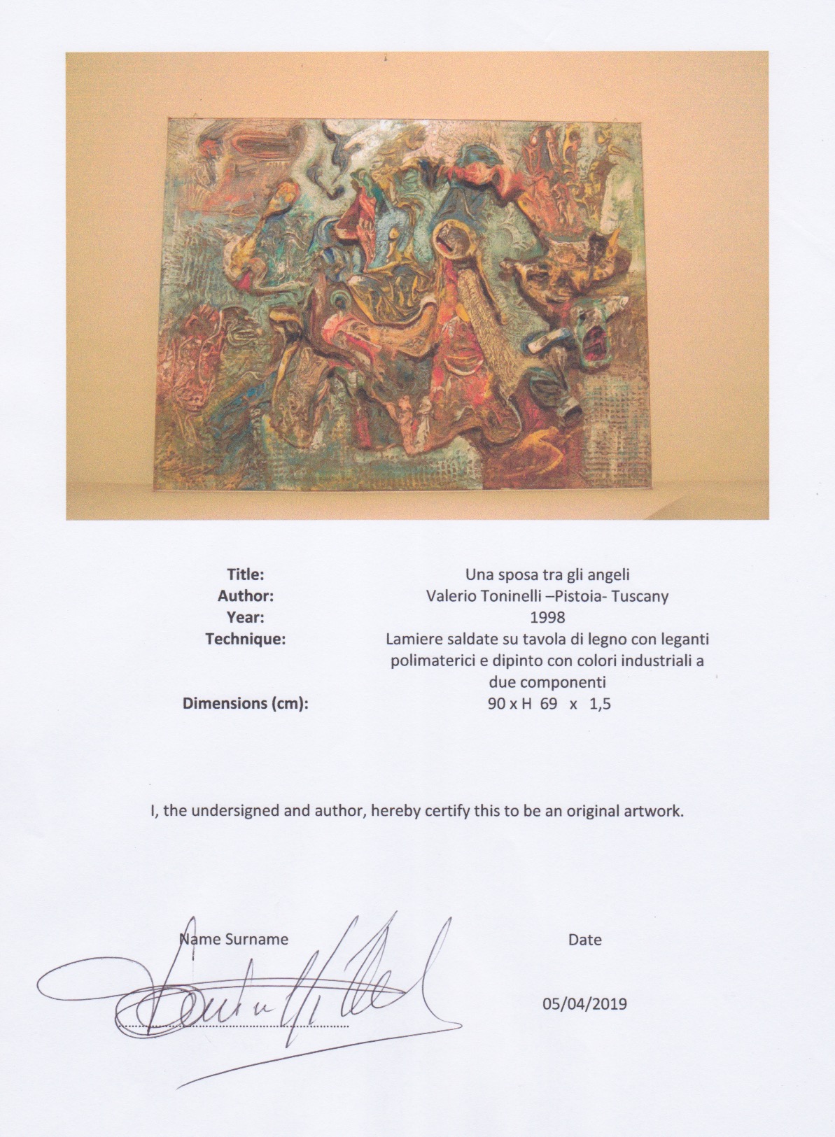 PARTICOLARE TECNICA "LAMIERE SALDATE SU TAVOLA DI LEGNO CON LEGANTI POLIMATERICI E DIPINTO CON COLORI INDUSTRIALI A DUE COMPONENTI".